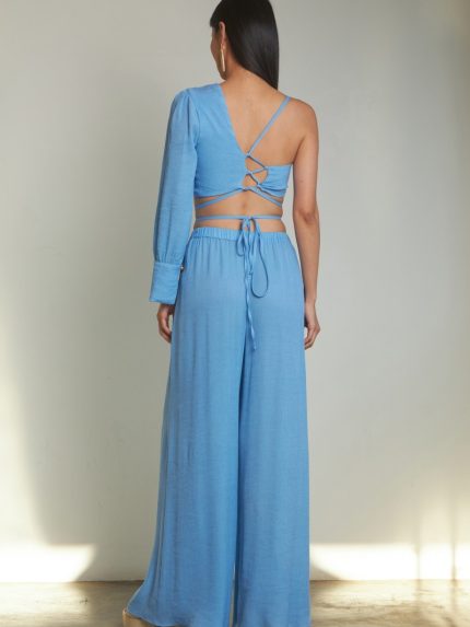 High Waisted Crinkle Trousers – White / Blue / Black