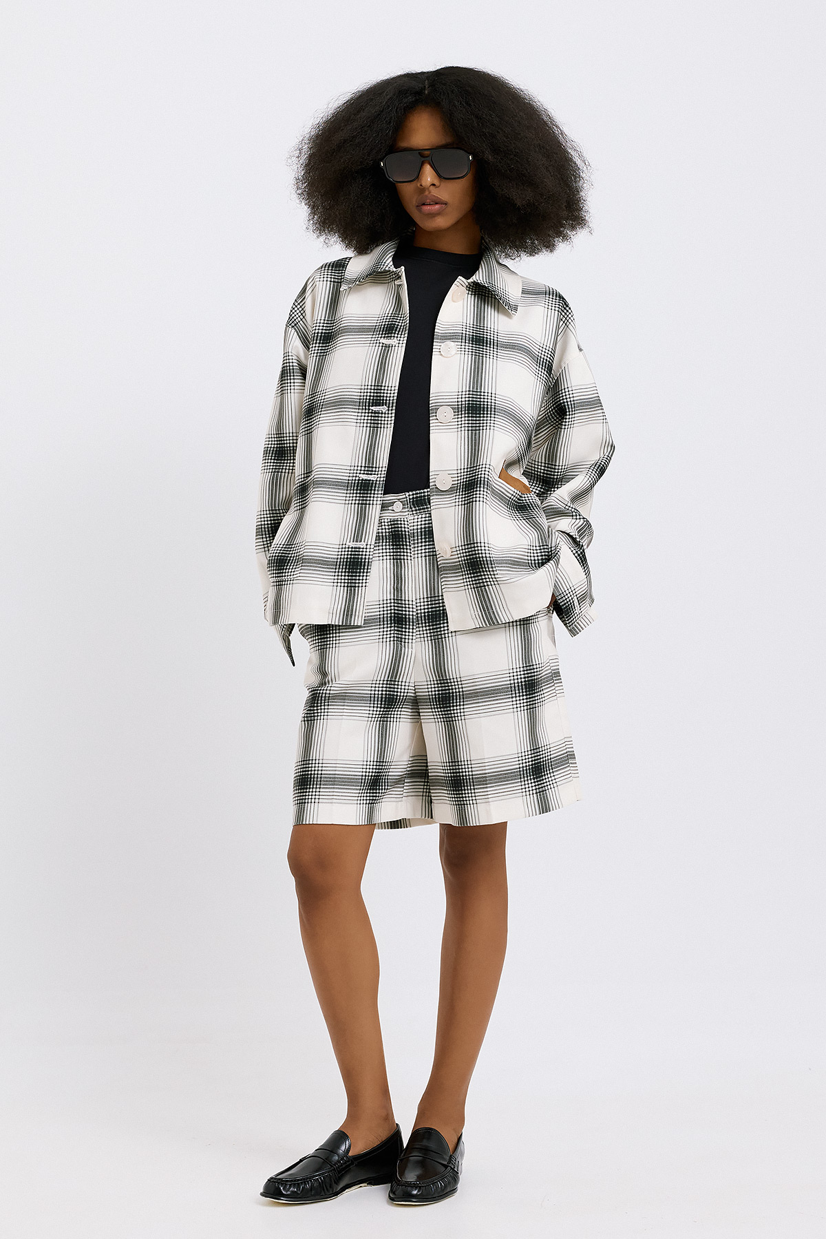 Βερμούδα γυναικεία με κομψό καρό σχέδιο σε ασπρόμαυρους τόνους, ιδανική για σύγχρονες και στιλάτες εμφανίσεις. Διαθέτει ψηλόμεση γραμμή που αγκαλιάζει τη μέση και προσφέρει άνετη εφαρμογή, ενώ το μήκος μέχρι το γόνατο χαρίζει διαχρονική κομψότητα. Κλείνει με κουμπί και φερμουάρ και διαθέτει θηλιές για ζώνη, ώστε να προσαρμόζεται εύκολα σε κάθε look. Το ύφασμα έχει σταθερή αλλά άνετη υφή, διατηρώντας όμορφα τη φόρμα του καθ’ όλη τη διάρκεια της ημέρας. Συνδυάζεται άψογα με πουκάμισο ή σακάκι για office εμφανίσεις, αλλά και με ένα απλό top για πιο casual chic σύνολα.