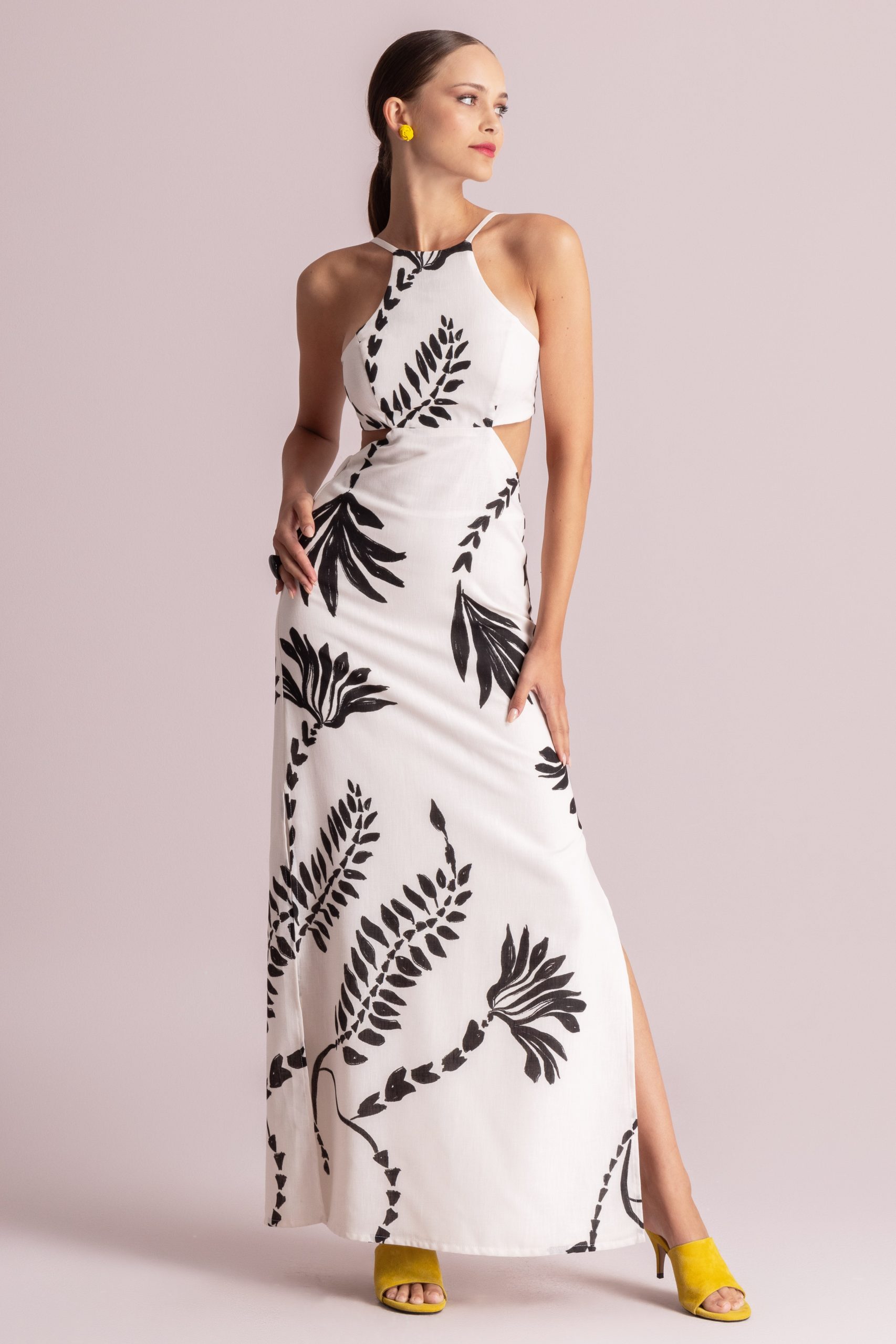 Maxi φόρεμα με σύγχρονη, αρχιτεκτονική γραμμή που συνδυάζει καθαρές επιφάνειες με θηλυκές καμπύλες. Το επάνω μέρος διαθέτει halter λαιμόκοψη και εφαρμοστό μπούστο, ενώ τα πλαϊνά cut–outs στη μέση δημιουργούν ένα κομψό παιχνίδι αποκαλύψεων, τονίζοντας τη σιλουέτα. Η φούστα πέφτει ίσια και μακριά, αγκαλιάζοντας το σώμα και καταλήγοντας σε διακριτικό άνοιγμα στο πλάι που προσθέτει κίνηση και άνεση. Το μοτίβο αναπτύσσεται κατακόρυφα, επιμηκύνοντας οπτικά τη γραμμή. Στο πίσω μέρος, οι λεπτές τιράντες και το δέσιμο με φιόγκο χαρίζουν ρομαντική διάθεση, ενώ η ανοιχτή πλάτη ενισχύει τον δυναμικό, καλοκαιρινό χαρακτήρα του κομματιού.