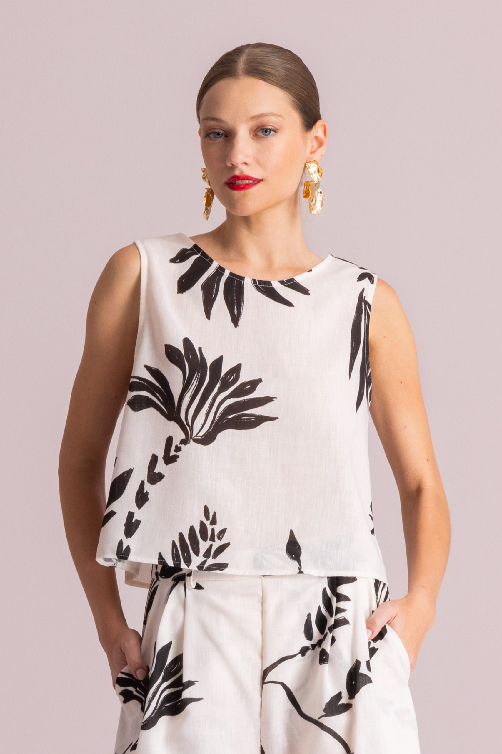 Αμάνικο top σε ίσια, ελαφρώς κοντή γραμμή με στρογγυλεμένο ντεκολτέ και καθαρές, μίνιμαλ γραμμές. Η λιτή κατασκευή του επιτρέπει στο μοτίβο να πρωταγωνιστήσει, δημιουργώντας έντονη αντίθεση και ενδιαφέρον. Το τελείωμα πέφτει ελεύθερα, προσφέροντας ευελιξία στο styling – μπορεί να φορεθεί μέσα από τη μέση ή χαλαρά πάνω από παντελόνες και φούστες. Ένα κομμάτι σύγχρονο και ευκολοφόρετο, που λειτουργεί τόσο μόνο του όσο και ως μέρος ενός ολοκληρωμένου σετ.