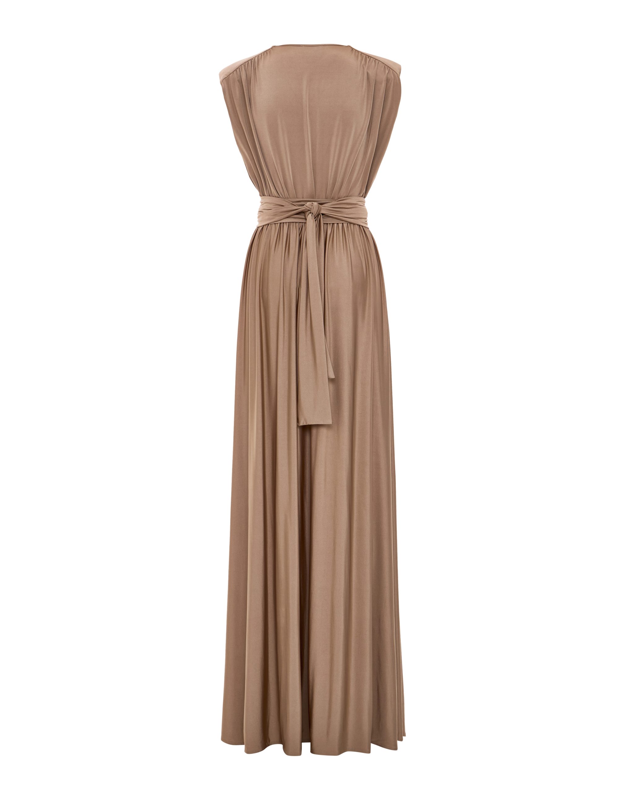 Ένα φόρεμα που συνδυάζει αέρινη κομψότητα με σύγχρονη αισθητική. Η ρευστή γραμμή του πέφτει απαλά στο σώμα, δημιουργώντας μια φίνα και επιμήκη σιλουέτα που κινείται με χάρη. Το βαθύ V ντεκολτέ αναδεικνύει το πάνω μέρος του σώματος με διακριτική θηλυκότητα, ενώ οι δομημένοι ώμοι προσθέτουν μια μοντέρνα και δυναμική πινελιά στο σχέδιο. Η μέση τονίζεται μέσα από τη ζώνη που αγκαλιάζει το σώμα και ολοκληρώνεται με μια ιδιαίτερη μεταλλική λεπτομέρεια, προσφέροντας χαρακτήρα και κομψότητα. Η μακριά, αέρινη φούστα ολοκληρώνει το σύνολο με κίνηση και ελαφρότητα, ενώ η λεπτομέρεια της ζώνης στο πίσω μέρος δίνει μια εκλεπτυσμένη τελική πινελιά. Ένα φόρεμα που ισορροπεί ιδανικά ανάμεσα στη διαχρονική φινέτσα και τη σύγχρονη κομψότητα.