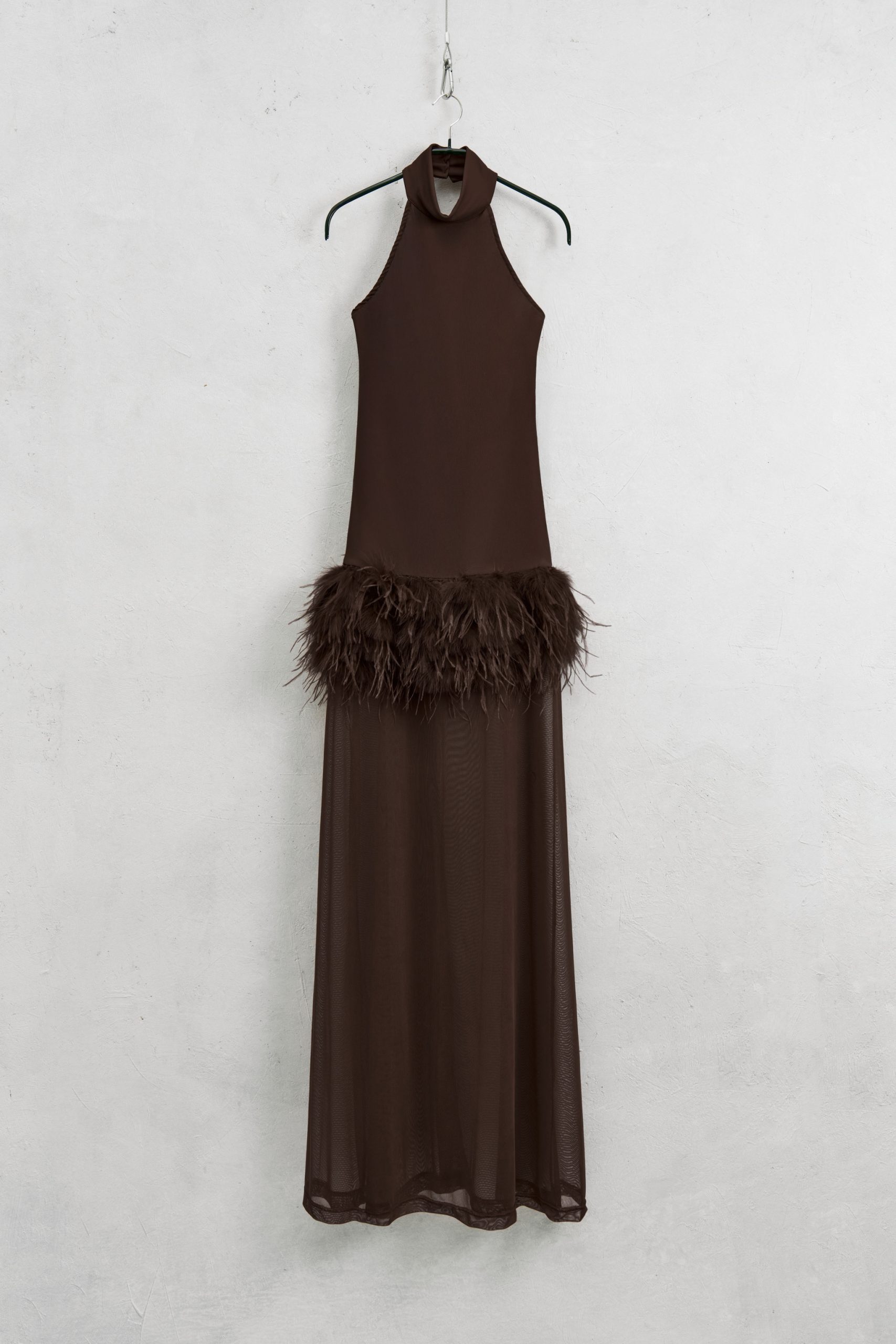 Ένα φόρεμα που παίζει με την αρχιτεκτονική της σιλουέτας και την υλικότητα με τρόπο σχεδόν σκηνογραφικό. Η καθαρή, μίνιμαλ γραμμή στο επάνω μέρος –με τον ψηλό λαιμό και τους κομψά ανοιχτούς ώμους– δημιουργεί μια ήρεμη, εκλεπτυσμένη βάση, πάνω στην οποία “κάθεται” ένα απροσδόκητο, θεατρικό στοιχείο: το πλούσιο στεφάνι από φτερά στη μέση. Η αντίθεση ανάμεσα στο δομημένο top και στη ρευστή, ημιδιάφανη φούστα που ακολουθεί από κάτω προσδίδει κίνηση, αέρα και μια σχεδόν αιθέρια ελαφρότητα. Το αποτέλεσμα είναι ένα κομμάτι που δεν χρειάζεται έντονο χρώμα για να ξεχωρίσει· το κάνει μέσα από την υφή, το παιχνίδι των υλικών και την ισχυρή, σύγχρονη παρουσία του.