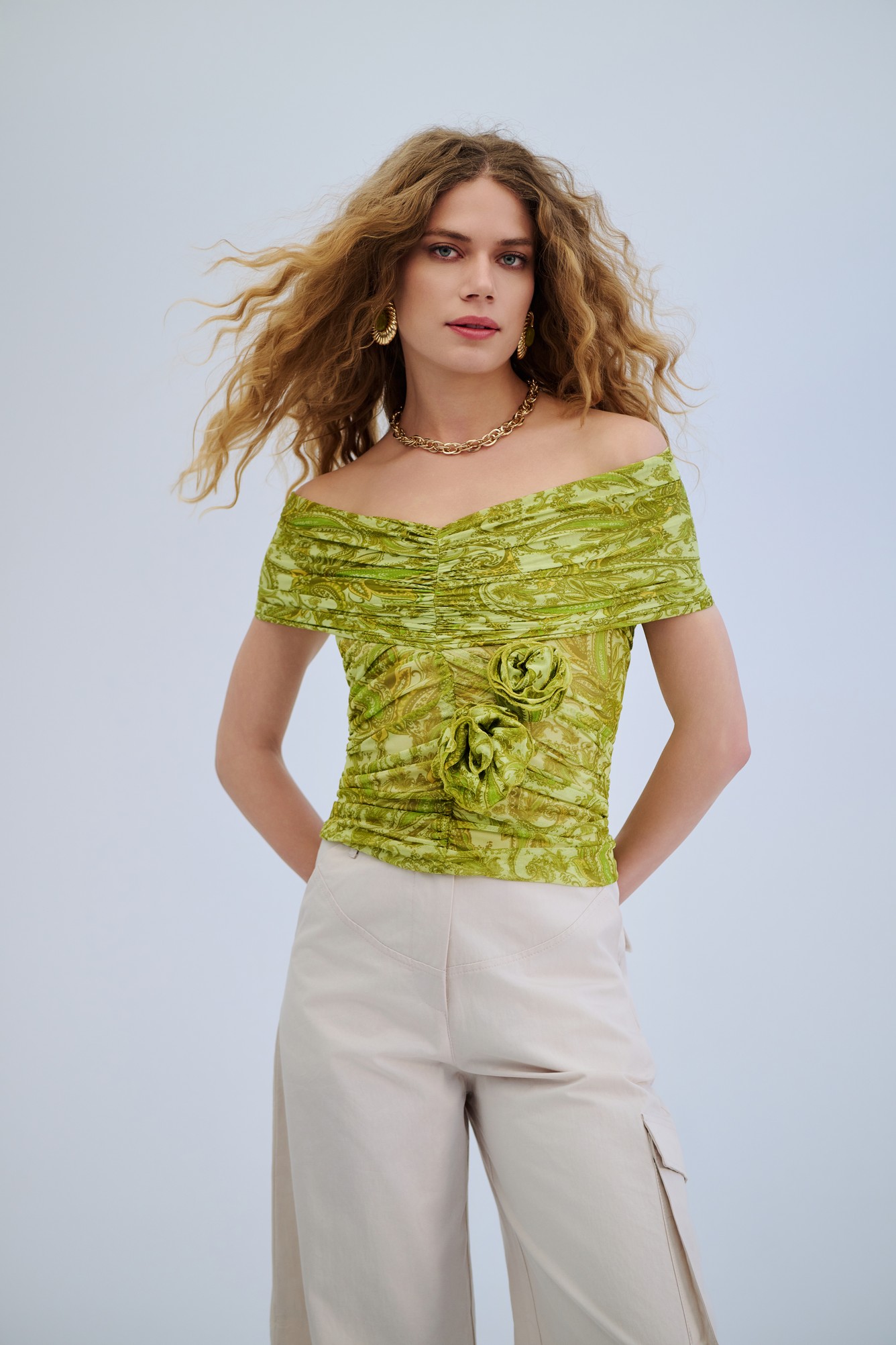 Ένα εντυπωσιακό, πολυμορφικό top που μπορεί να φορεθεί με διαφορετικούς τρόπους, προσαρμόζοντας το ύφος του ανάλογα με το styling. Το draping στο μπροστινό μέρος αγκαλιάζει τη σιλουέτα και δημιουργεί κολακευτική εφαρμογή, ενώ η ιδιαίτερη κατασκευή του επιτρέπει εναλλαγές – από strapless μέχρι πιο δημιουργικά δεσίματα. Ένα statement κομμάτι που μεταμορφώνεται εύκολα από βραδινό σε elevated day look.