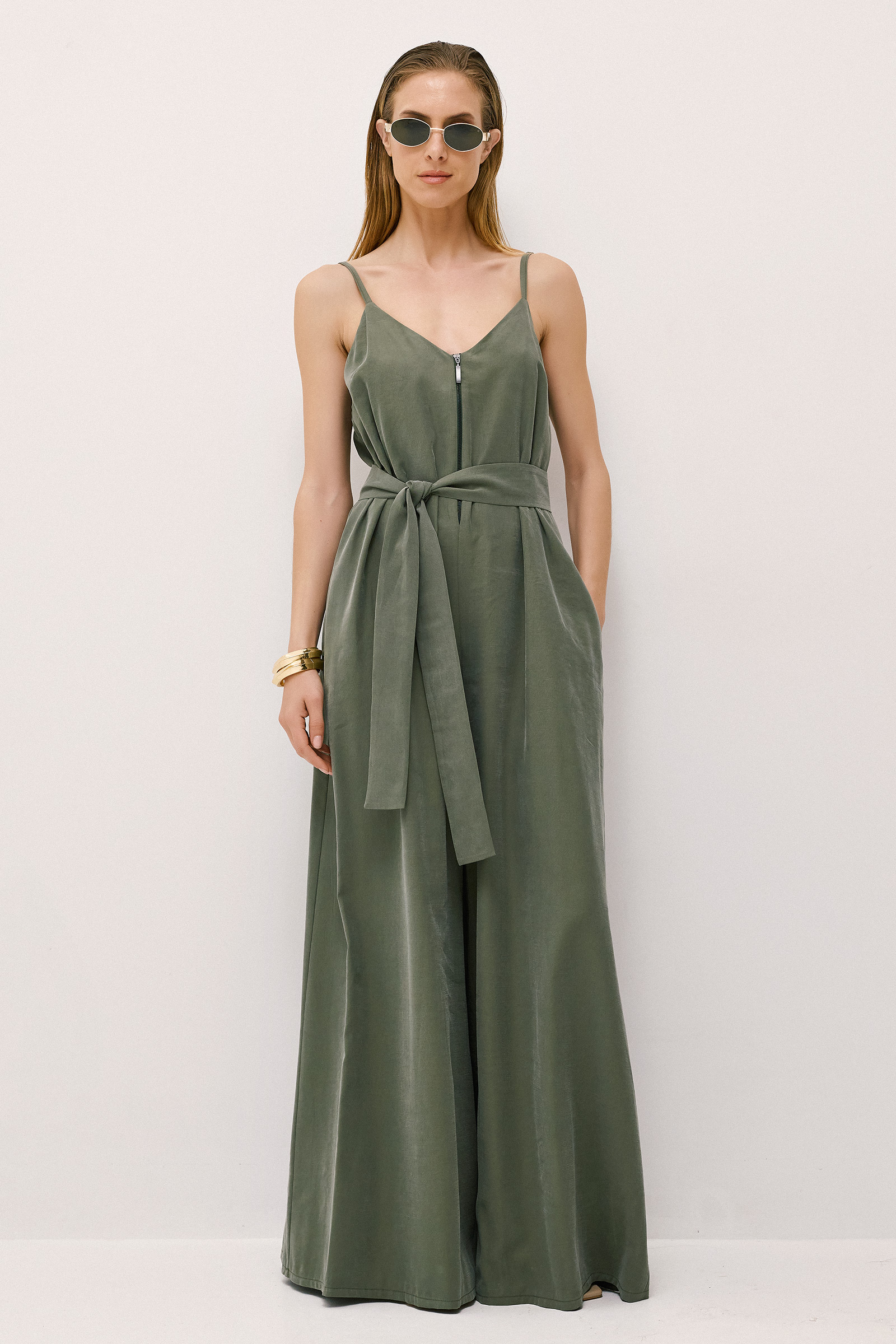 Ολόσωμη φόρμα με κομψό και άνετο σχεδιασμό. Διαθέτει τιράντες και V ντεκολτέ που αναδεικνύουν το πάνω μέρος, ενώ η μέση τονίζεται με ζώνη από το ίδιο ύφασμα για καλύτερη εφαρμογή και θηλυκή γραμμή. Το κάτω μέρος είναι σε φαρδιά γραμμή, προσφέροντας κίνηση και αέρινη αίσθηση. Ιδανική επιλογή για εμφανίσεις που συνδυάζουν άνεση και στυλ, από πρωινές έως πιο βραδινές περιστάσεις.