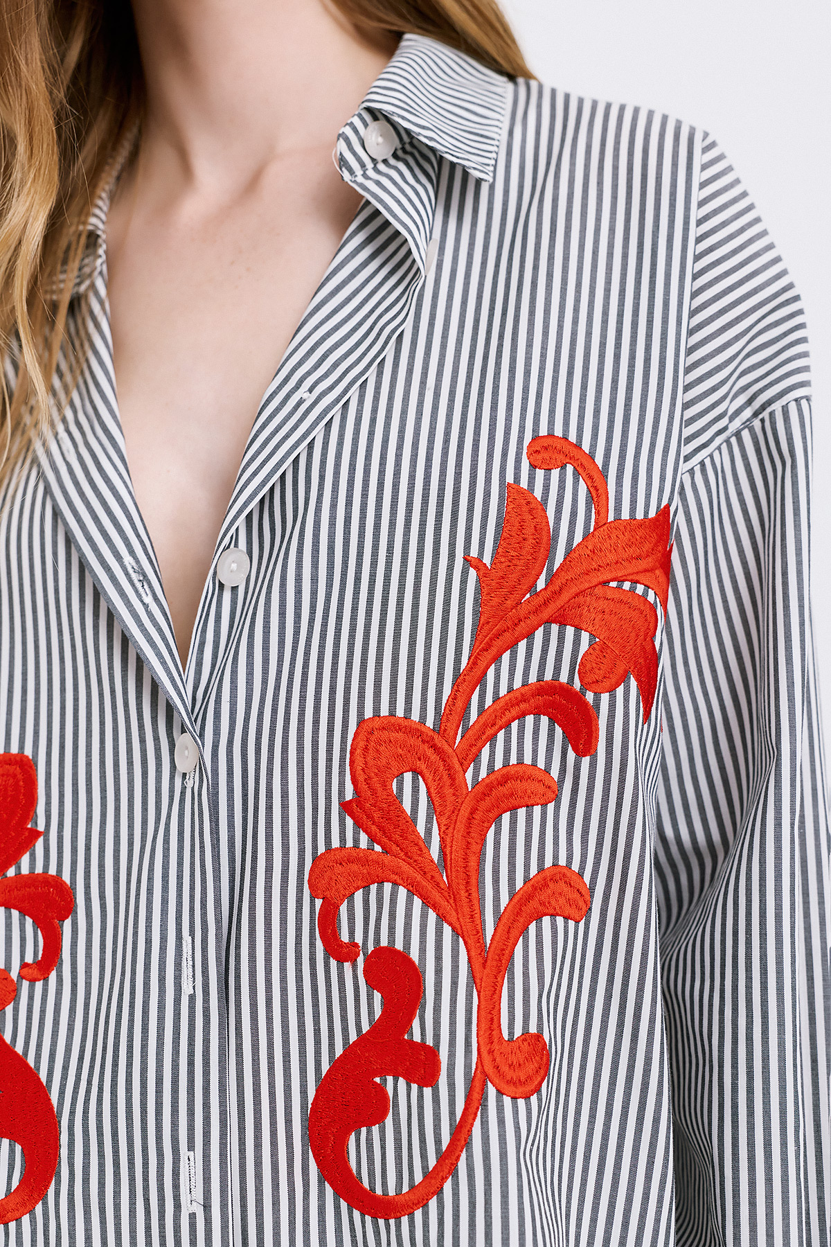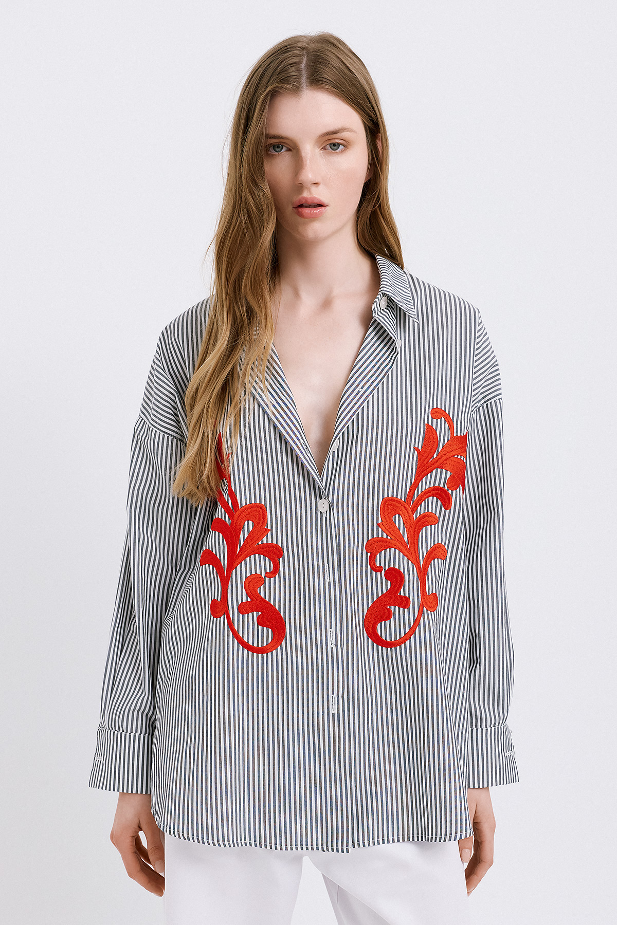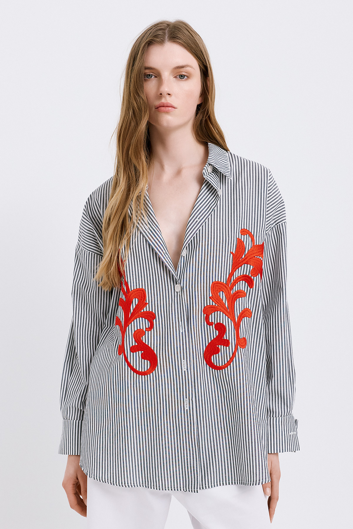Γυναικείο πουκάμισο σε άνετη, ίσια γραμμή με διαχρονικό ριγέ μοτίβο που χαρίζει κομψότητα και φρεσκάδα σε κάθε εμφάνιση. Διαθέτει κλασικό γιακά και κλείσιμο με κουμπιά στο μπροστινό μέρος, ενώ τα μακριά μανίκια με μανσέτα ολοκληρώνουν το refined ύφος του. Το ιδιαίτερο στοιχείο του σχεδίου είναι τα εντυπωσιακά κεντήματα σε έντονη αντίθεση στο μπροστινό μέρος, που προσθέτουν statement χαρακτήρα και μοντέρνα αισθητική. Το ύφασμα είναι ελαφρύ και ευχάριστο στην αφή, ιδανικό για άνετη εφαρμογή καθ’ όλη τη διάρκεια της ημέρας. Συνδυάζεται εύκολα με υφασμάτινο παντελόνι για chic office looks ή με denim για πιο casual εμφανίσεις. Ένα ξεχωριστό κομμάτι που αναβαθμίζει κάθε σύνολο.