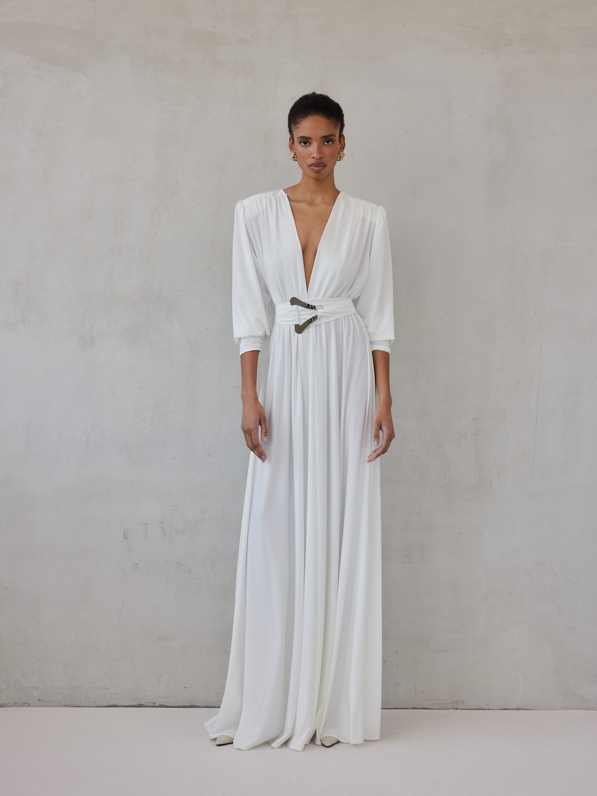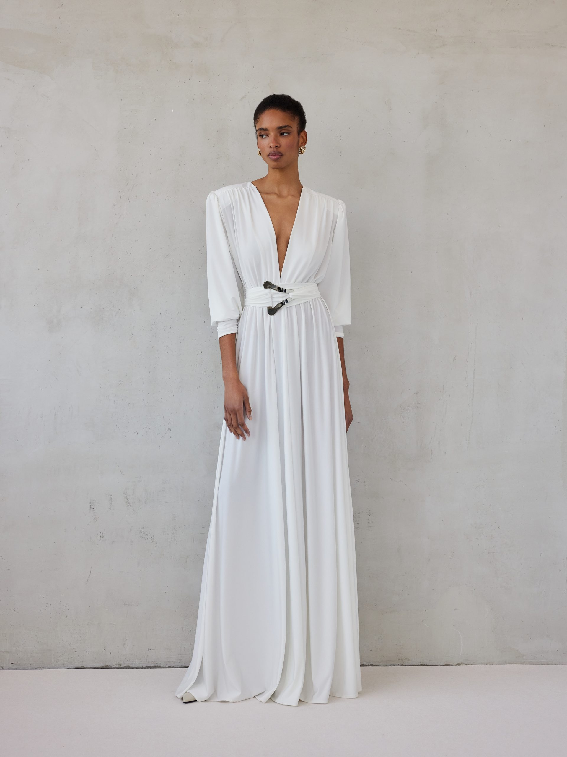 Ένα φόρεμα που αποπνέει δυναμισμό και κομψότητα. Η βαθιά V λαιμόκοψη και η εντυπωσιακή ζώνη με μεταλλική λεπτομέρεια τονίζουν τη μέση, ενώ η ρευστή γραμμή του χαρίζει κίνηση και θηλυκότητα. Ιδανικό για βραδινές εμφανίσεις που δεν περνούν απαρατήρητες.