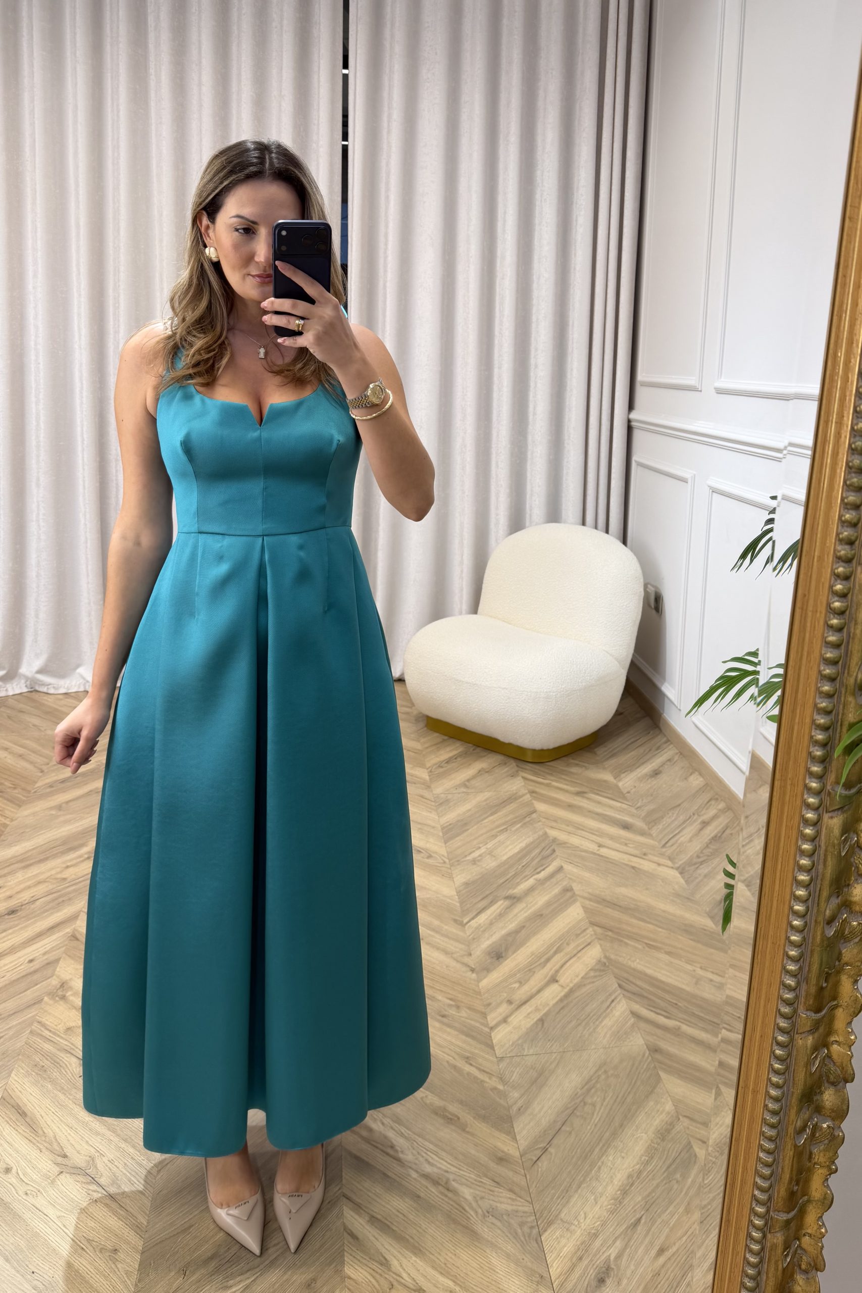 Ένα εντυπωσιακό μάξι φόρεμα από ταφτά που αποπνέει κομψότητα και διαχρονική θηλυκότητα. Το δομημένο μπούστο με διακριτικό άνοιγμα στο ντεκολτέ αναδεικνύει το επάνω μέρος, ενώ η τονισμένη μέση και η πλούσια Α-line φούστα χαρίζουν κίνηση και αριστοκρατικό χαρακτήρα σε κάθε σου βήμα. Το ύφασμα ταφτάς προσφέρει σταθερότητα και πολυτελή υφή, δημιουργώντας μια εντυπωσιακή σιλουέτα ιδανική για επίσημες εμφανίσεις, γάμους και ιδιαίτερες περιστάσεις.