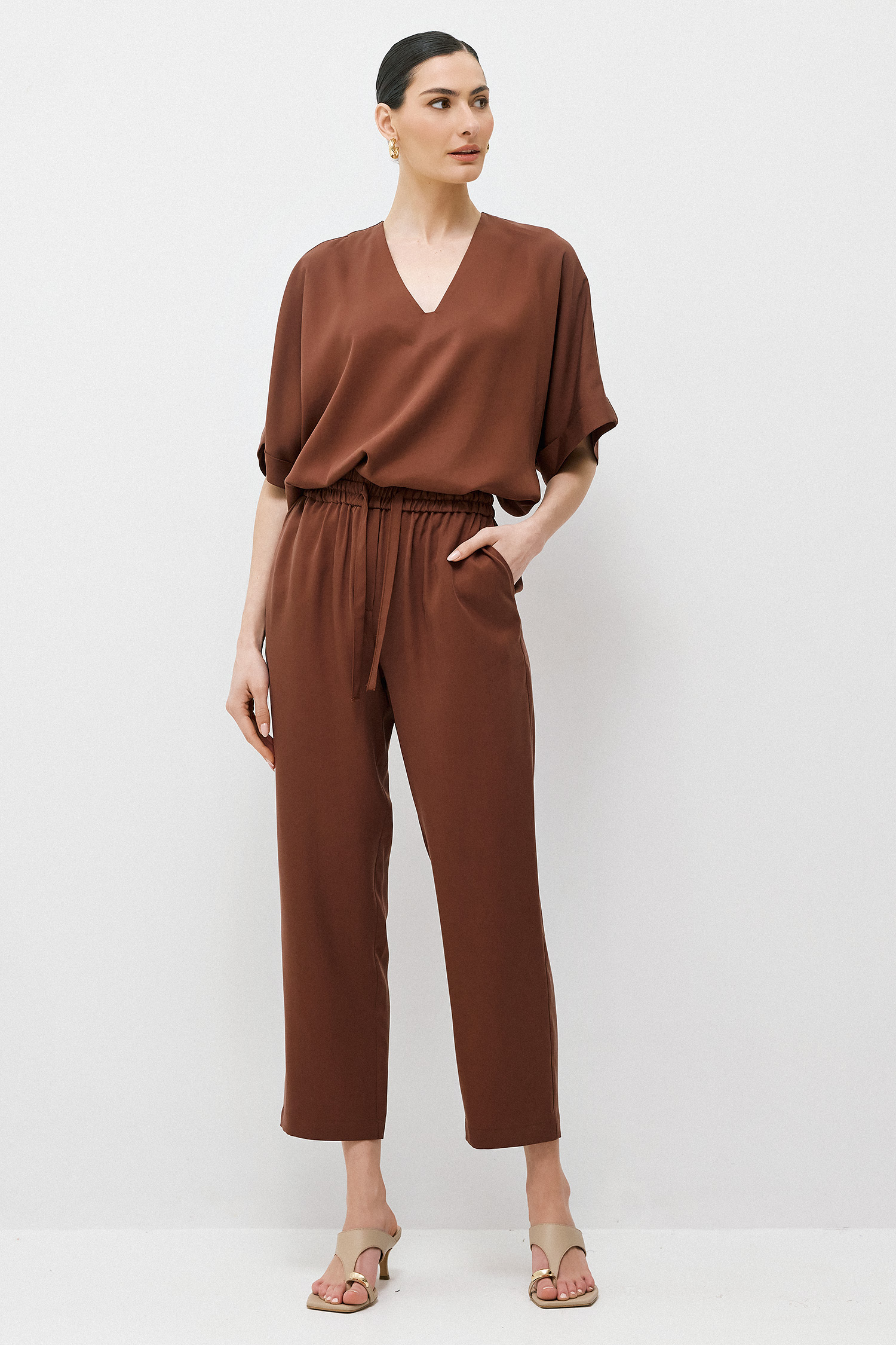 Ένα σύγχρονο σετ που εκφράζει την έννοια της effortless κομψότητας μέσα από χαλαρές γραμμές και προσεγμένη απλότητα. Το top με V λαιμόκοψη και άνετη εφαρμογή πέφτει φυσικά στο σώμα, δημιουργώντας μια αίσθηση ρευστότητας και ανεπιτήδευτης φινέτσας. Το παντελόνι ακολουθεί την ίδια φιλοσοφία, με ελαστική μέση και κορδόνι που προσθέτει λειτουργικότητα και άνεση, ενώ η ίσια γραμμή του χαρίζει ισορροπία και καθαρότητα στη σιλουέτα. Το σετ αγκαλιάζει το σώμα χωρίς να το περιορίζει, επιτρέποντας ελευθερία κινήσεων και μία σύγχρονη, relaxed αισθητική. Ιδανικό για all-day εμφανίσεις, μεταβαίνει εύκολα από casual στιγμές σε πιο προσεγμένα looks, ανάλογα με το styling. Ένα minimal yet refined σύνολο που επενδύει στη διαχρονικότητα και τη διακριτική κομψότητα.