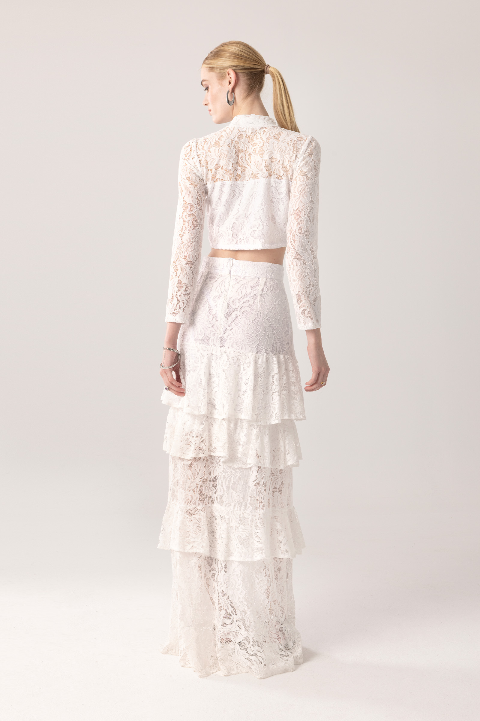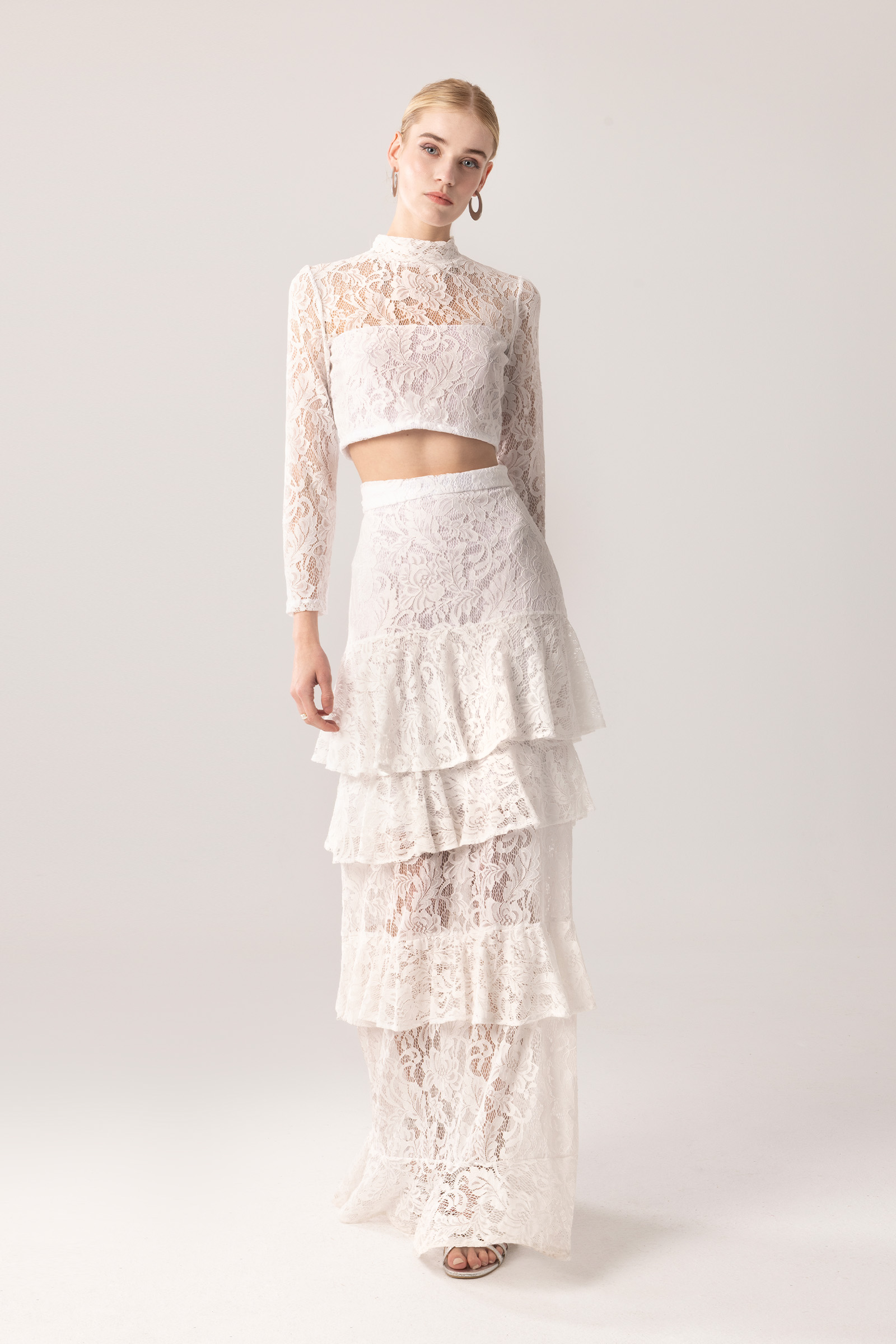 Αναδείξτε τη θηλυκότητά σας με αυτή τη ρομαντική, μακριά φούστα από φίνα δαντέλα. Το εντυπωσιακό σχέδιο με διαφάνειες και τα διαδοχικά βολάν χαρίζουν κίνηση και αέρινη κομψότητα σε κάθε σας βήμα. Η ψηλόμεση γραμμή αγκαλιάζει τη σιλουέτα, προσφέροντας θηλυκή εφαρμογή, ενώ το μάξι μήκος δημιουργεί ένα εκλεπτυσμένο και ιδιαίτερο αποτέλεσμα. Ιδανική για επίσημες εμφανίσεις, καλοκαιρινές βαφτίσεις , bridal look ή ρομαντικές βραδινές εξόδους, συνδυάζεται τέλεια με το αντίστοιχο τοπ για ένα ολοκληρωμένο σύνολο ή με ένα απλό πουκάμισο για πιο minimal chic διάθεση.