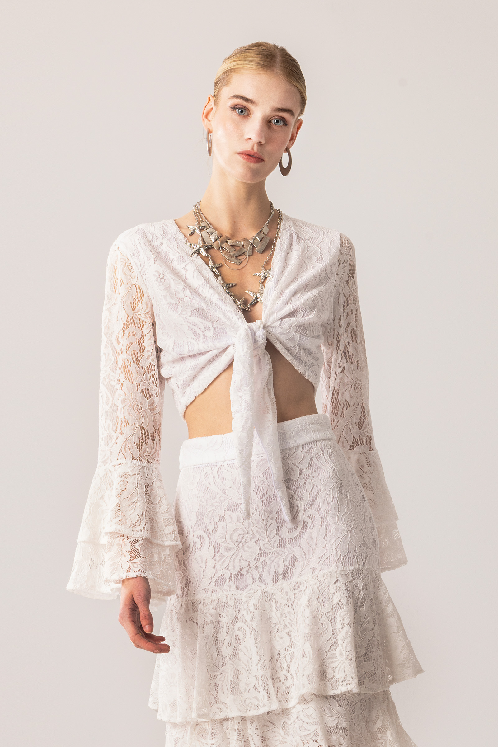 Αέρινο και άκρως θηλυκό, αυτό το δαντελένιο crop top ξεχωρίζει για το εντυπωσιακό δέσιμο στο μπροστινό μέρος που δημιουργεί ένα κομψό V ντεκολτέ. Η φίνα δαντέλα με διακριτική διαφάνεια χαρίζει ρομαντική διάθεση, ενώ τα μακριά μανίκια με βολάν στο τελείωμα προσθέτουν κίνηση και boho χαρακτήρα. Η cropped γραμμή αναδεικνύει τη μέση και συνδυάζεται ιδανικά με ψηλόμεσες φούστες ή παντελόνια για ένα ολοκληρωμένο, elegant look. Ιδανική επιλογή για καλοκαιρινές εμφανίσεις, νησιώτικες εξόδους ή ιδιαίτερες περιστάσεις.