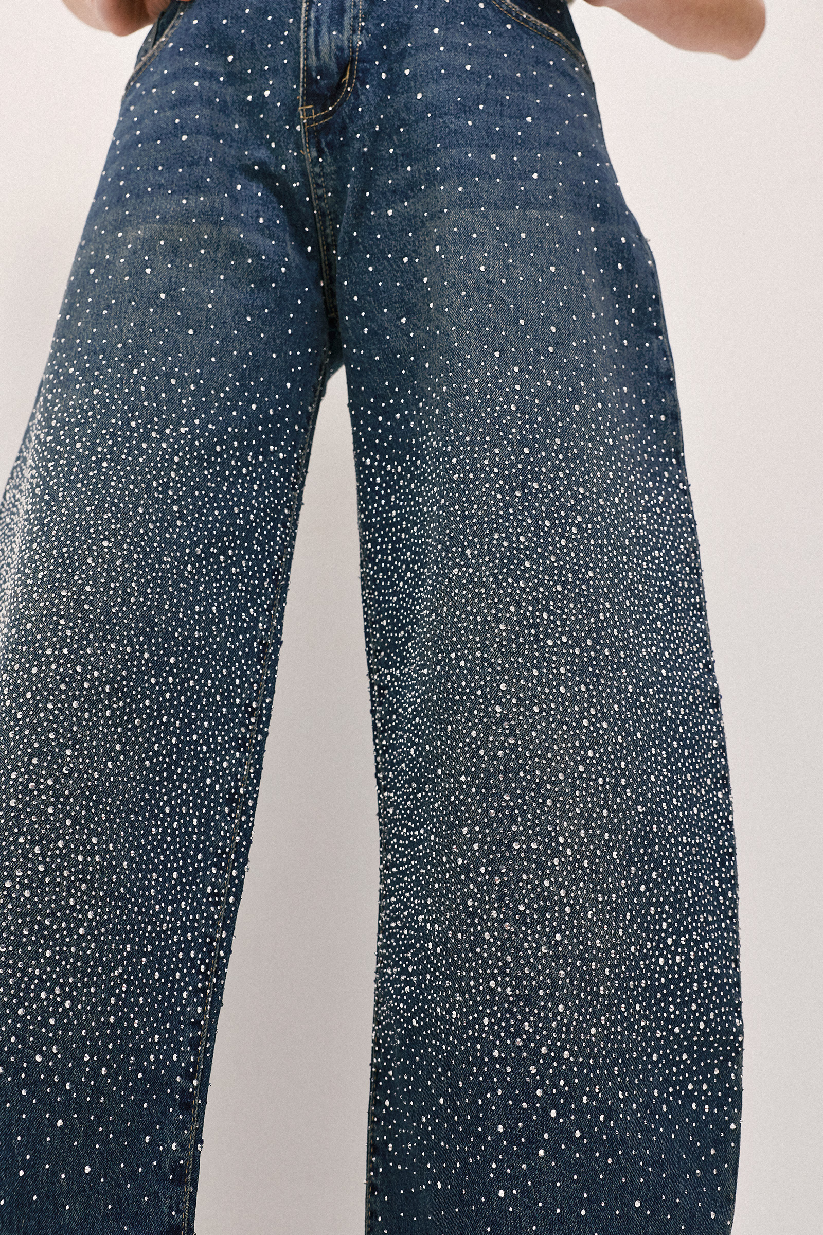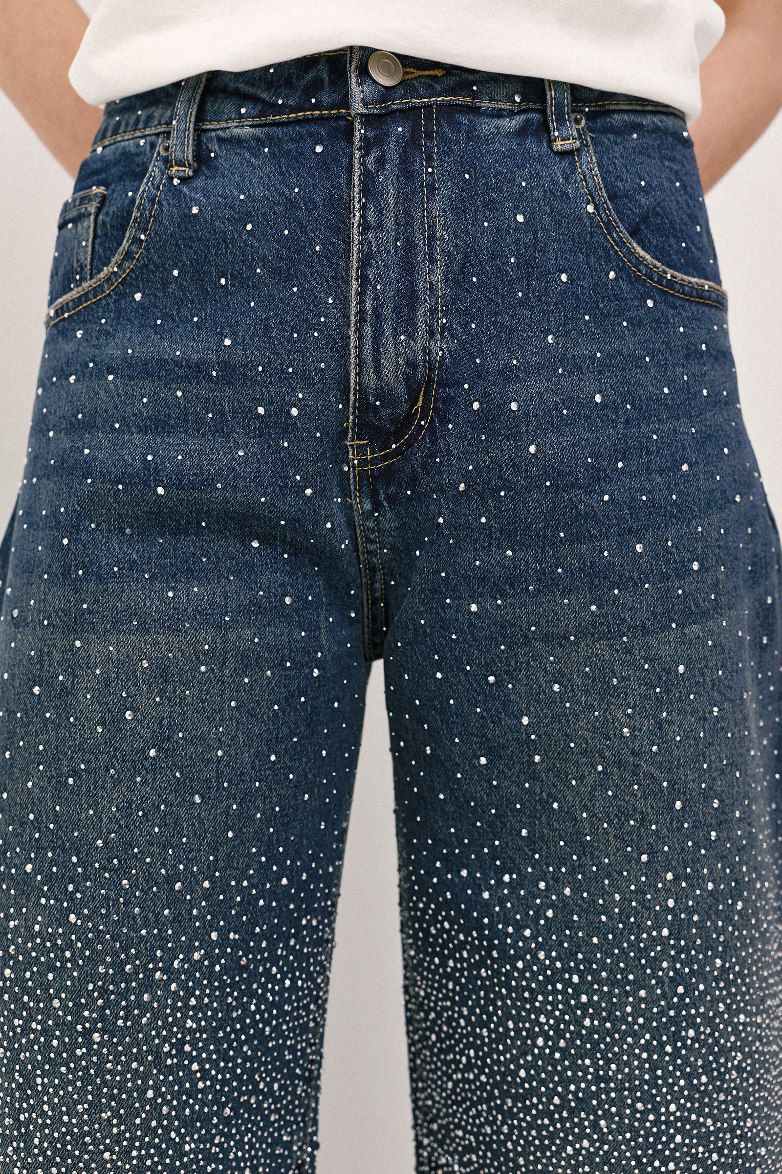 Ένα fashion-forward τζιν παντελόνι που συνδυάζει τη διαχρονικότητα του denim με μια διακριτική δόση λάμψης. Η ψηλόμεση γραμμή και το ίσιο προς φαρδύ πόδι δημιουργούν μια σύγχρονη, δυναμική σιλουέτα, ενώ τα μικρά στρας διάσπαρτα στην επιφάνεια προσθέτουν μια refined, σχεδόν κοσμηματική αίσθηση. Το αποτέλεσμα είναι ισορροπημένο και statement, ιδανικό για εμφανίσεις που κινούνται με άνεση από το casual στο πιο βραδινό styling. Ένα κομμάτι που αποπνέει effortless glamour και αναβαθμίζει κάθε σύνολο με σύγχρονη editorial αισθητική.