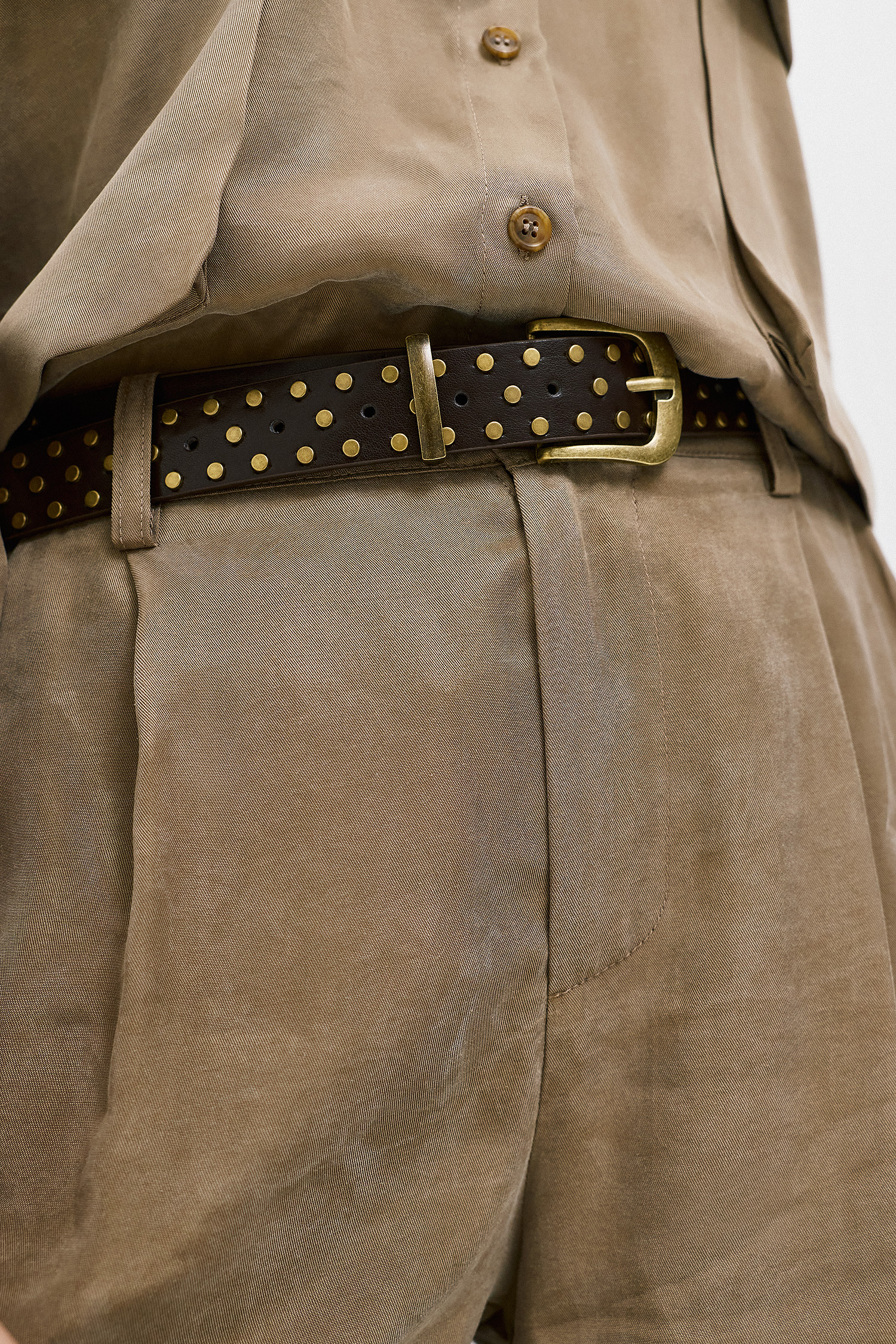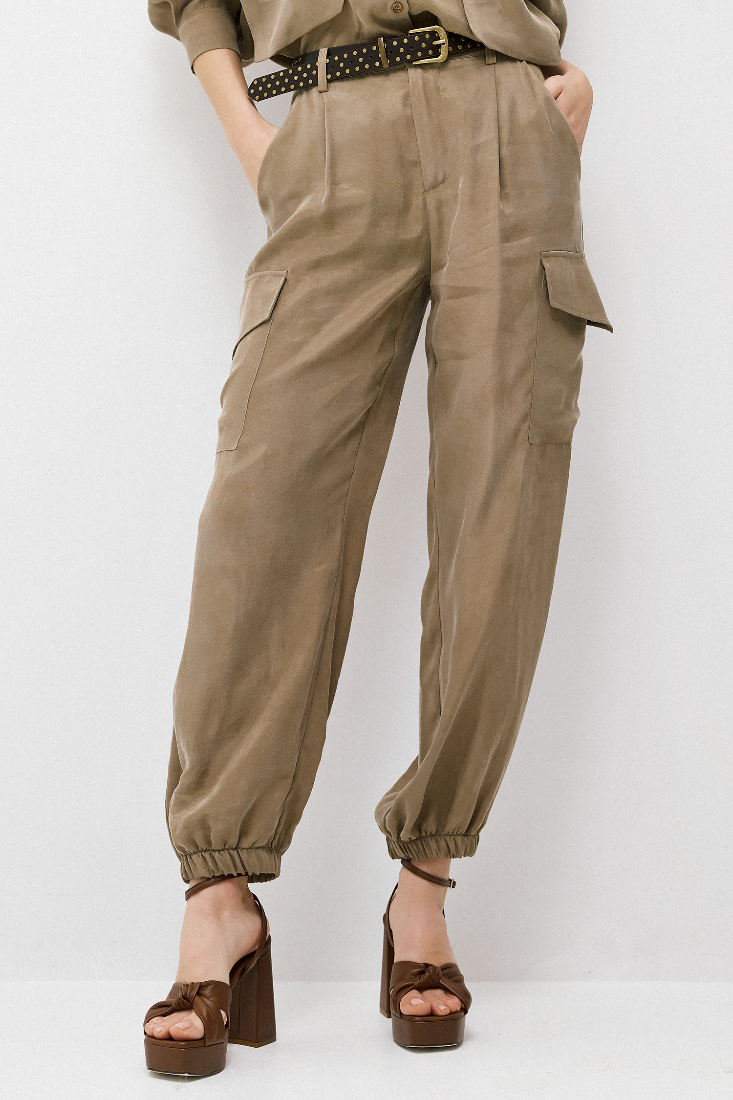 Cargo παντελόνι επανασχεδιασμένο με elevated αισθητική. Η σατινέ υφή του προσδίδει κομψότητα, ενώ οι λειτουργικές λεπτομέρειες – πλαϊνές τσέπες και ζώνη με διακριτικά studs – ενισχύουν τον utilitarian χαρακτήρα. Η χαλαρή γραμμή που καταλήγει σε ελαστικό τελείωμα δημιουργεί ένα σύγχρονο silhouette που συνδυάζει άνεση και στιλ. Ιδανικό για looks που κινούνται ανάμεσα στο casual και το refined.