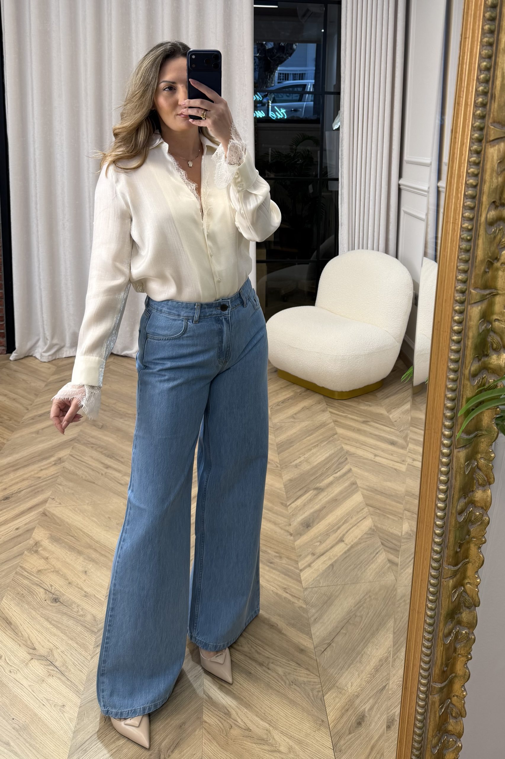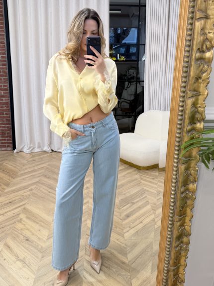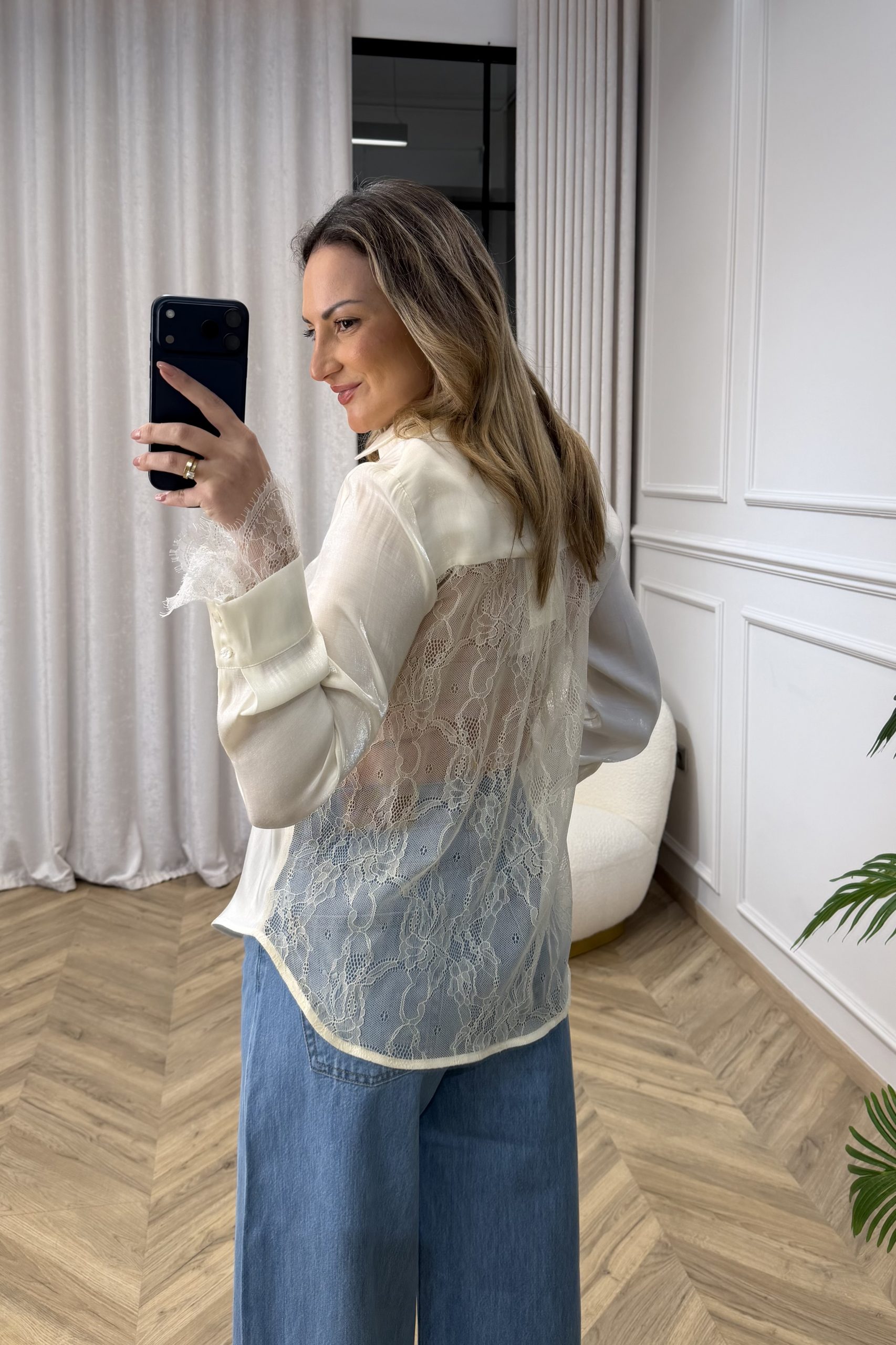 Ένα πουκάμισο που ισορροπεί ανάμεσα στη ρομαντική λεπτομέρεια και τη σύγχρονη κομψότητα. Η γραμμή του είναι ρευστή και ανάλαφρη, με απαλή κίνηση που αγκαλιάζει το σώμα χωρίς να το περιορίζει, δημιουργώντας μία φίνα, θηλυκή σιλουέτα. Η μπροστινή όψη διατηρεί μια καθαρή, minimal αισθητική, ενώ οι διακριτικές δαντελένιες λεπτομέρειες στα τελειώματα των μανικιών προσθέτουν υφή και εκλεπτυσμένο χαρακτήρα. Το στοιχείο που το καθιστά πραγματικά ξεχωριστό είναι η πλάτη: ένα εντυπωσιακό πάνελ από δαντέλα που αποκαλύπτει διακριτικά το δέρμα, δημιουργώντας έναν αέρα αισθησιασμού με απόλυτη ισορροπία. Ένα κομμάτι που συνδυάζει ρομαντισμό και σύγχρονη φινέτσα, ιδανικό για εμφανίσεις που θέλουν να ξεχωρίζουν μέσα από τις λεπτομέρειες και την ανεπιτήδευτη κομψότητα.