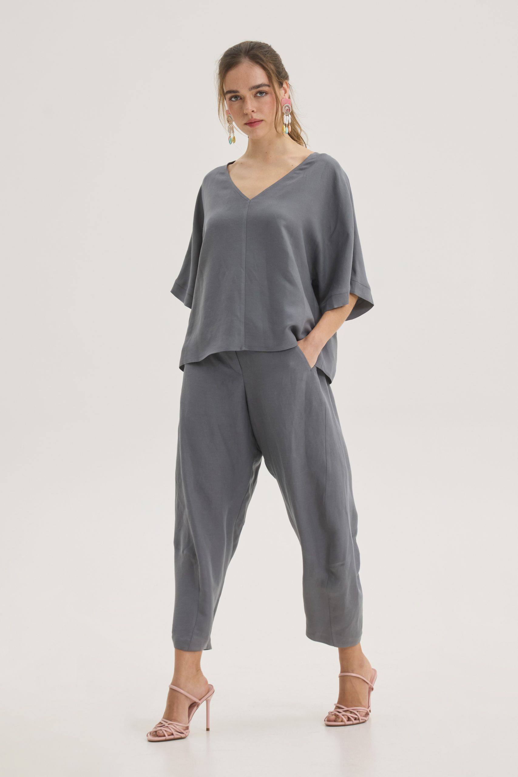 Minimal αισθητική και απόλυτη άνεση σε ένα κομψό γυναικείο σετ. Το σύνολο αποτελείται από μπλούζα με V ντεκολτέ και χαλαρή γραμμή με φαρδιά μανίκια, καθώς και παντελόνι σε άνετη, ίσια γραμμή που χαρίζει effortless κομψότητα. Η ανάλαφρη υφή του υφάσματος αγκαλιάζει το σώμα και προσφέρει άνεση καθ’ όλη τη διάρκεια της ημέρας, ενώ η ουδέτερη γκρι απόχρωση το καθιστά ιδανική επιλογή για chic καθημερινές αλλά και πιο προσεγμένες εμφανίσεις. Φορέστε το με πέδιλα για elegant look ή με sneakers για πιο casual διάθεση.