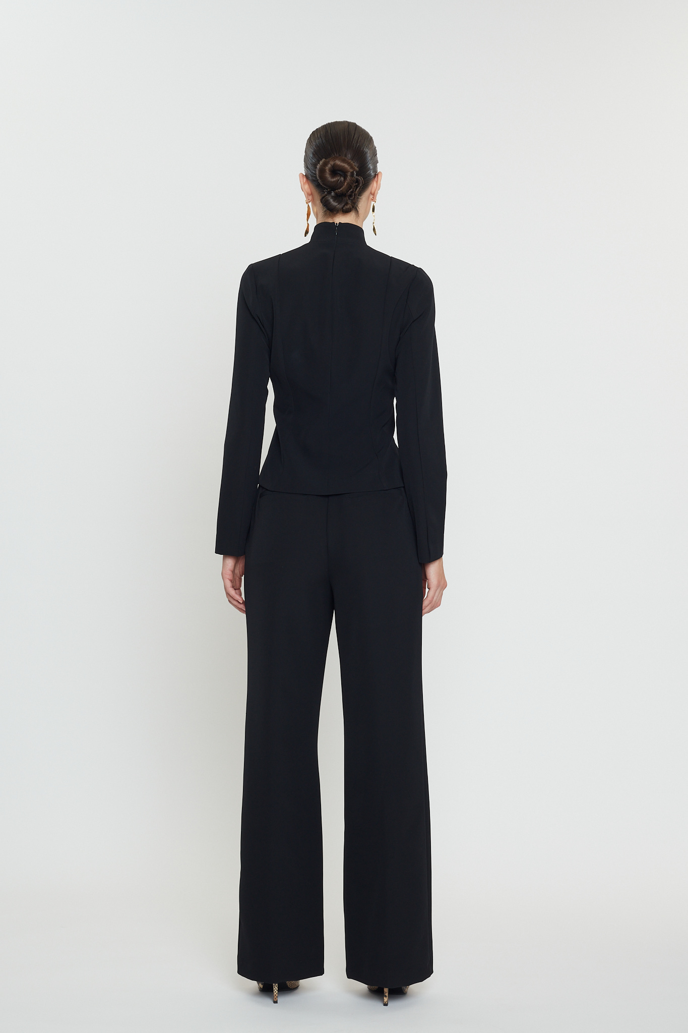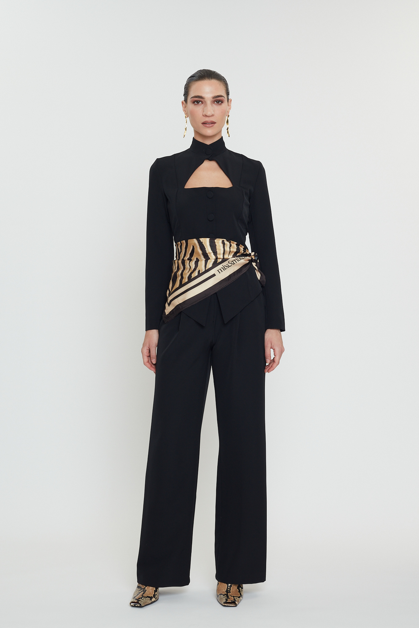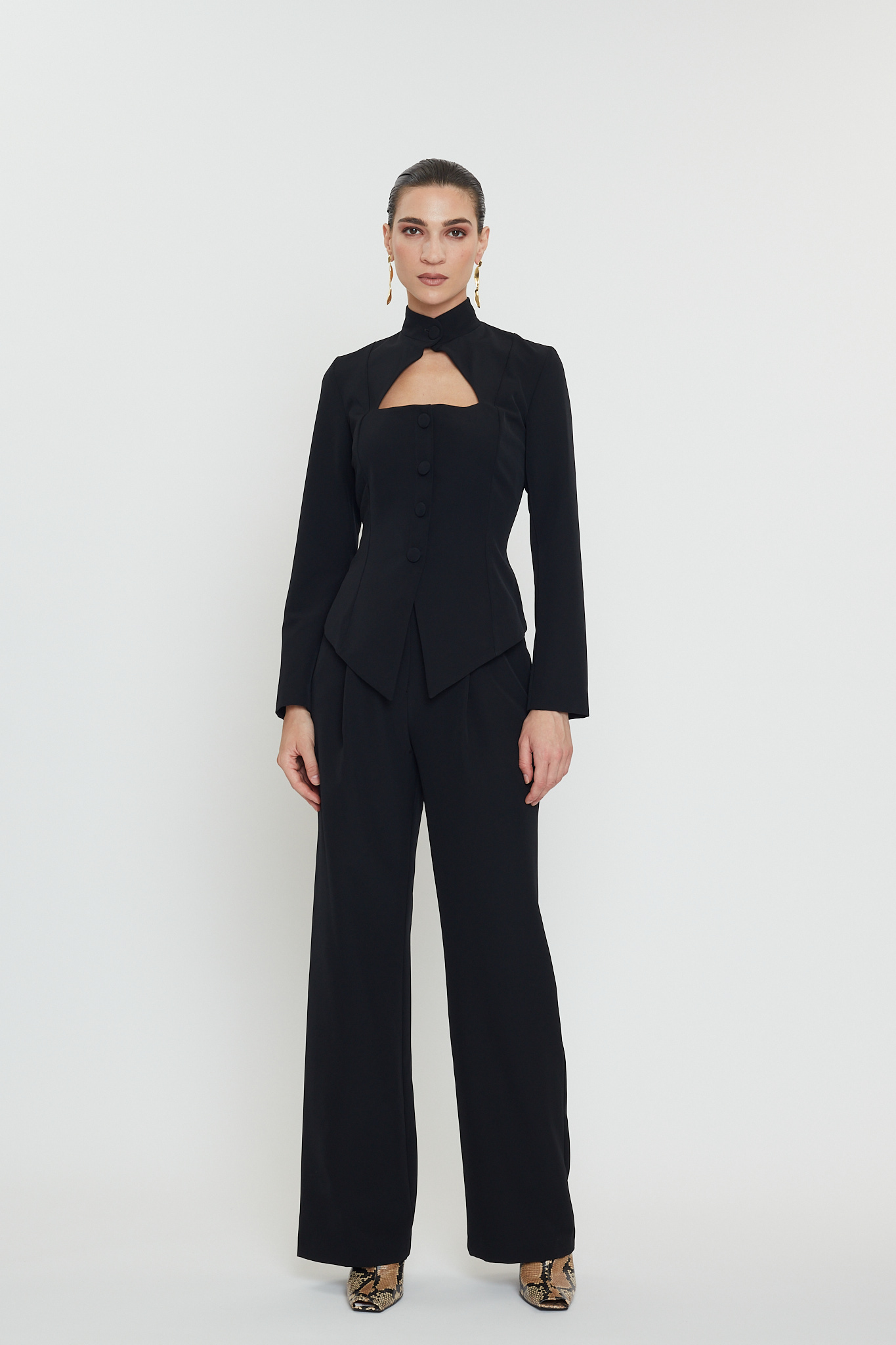 Ένα σύνολο που αποπνέει απόλυτη αυτοπεποίθηση και δυναμισμό. Η αυστηρή, αρχιτεκτονική γραμμή του σακακιού αγκαλιάζει τη σιλουέτα με τρόπο που συνδυάζει κομψότητα και σύγχρονη αισθητική, ενώ το εντυπωσιακό άνοιγμα στο μπούστο ανατρέπει τους κανόνες της κλασικής tailoring με μια τολμηρή, θηλυκή πινελιά. Τα καλόγουστα καλυμμένα κουμπιά και ο ψηλός λαιμόκομπος προσθέτουν επιπλέον δραματικότητα, δημιουργώντας ένα look που ισορροπεί ανάμεσα στη δύναμη και την εκλεπτυσμένη μυστικότητα. Το παντελόνι, με τη ρευστή του κίνηση και τη clean-cut εφαρμογή, ολοκληρώνει το outfit με έναν αέρα άνετης πολυτέλειας. Μαζί, συνθέτουν μια εικόνα διαχρονικά εντυπωσιακή—για γυναίκες που δεν ακολουθούν τη μόδα, αλλά τη διαμορφώνουν.