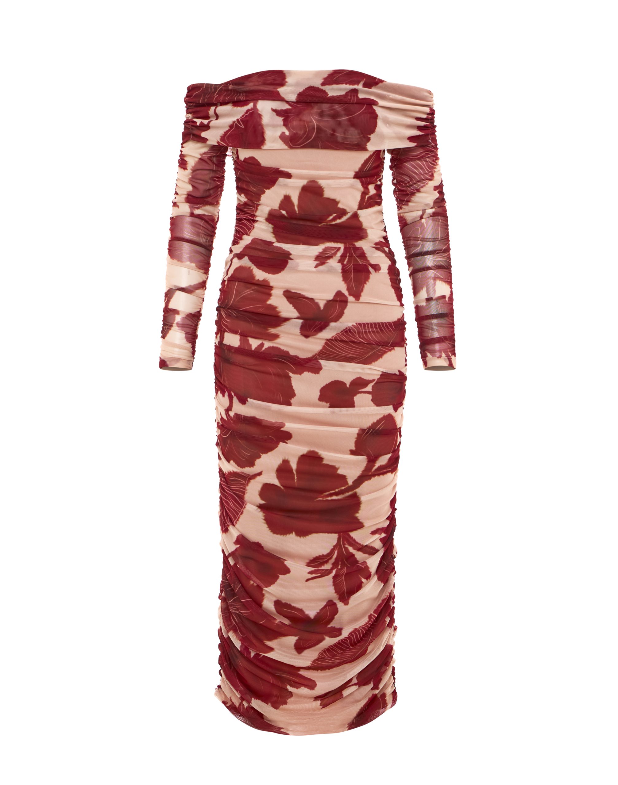 Ένα φόρεμα που συνδυάζει κομψότητα και σύγχρονη θηλυκότητα. Η εφαρμοστή γραμμή και το ντραπέ εφέ αγκαλιάζουν αρμονικά τη σιλουέτα, δημιουργώντας μια ιδιαίτερα κολακευτική φόρμα. Το off-shoulder σχέδιο αναδεικνύει διακριτικά τους ώμους, προσθέτοντας μια αίσθηση ανεπιτήδευτης κομψότητας. Τα μακριά μανίκια και η φίνα υφή του υφάσματος δίνουν βάθος και κίνηση στο σύνολο, ενώ το μήκος του φορέματος ολοκληρώνει την εμφάνιση με διαχρονική φινέτσα. Ένα κομμάτι που μπορεί να φορεθεί τόσο σε ιδιαίτερες περιστάσεις όσο και σε κομψές βραδινές εμφανίσεις, προσφέροντας δυναμισμό και στυλ