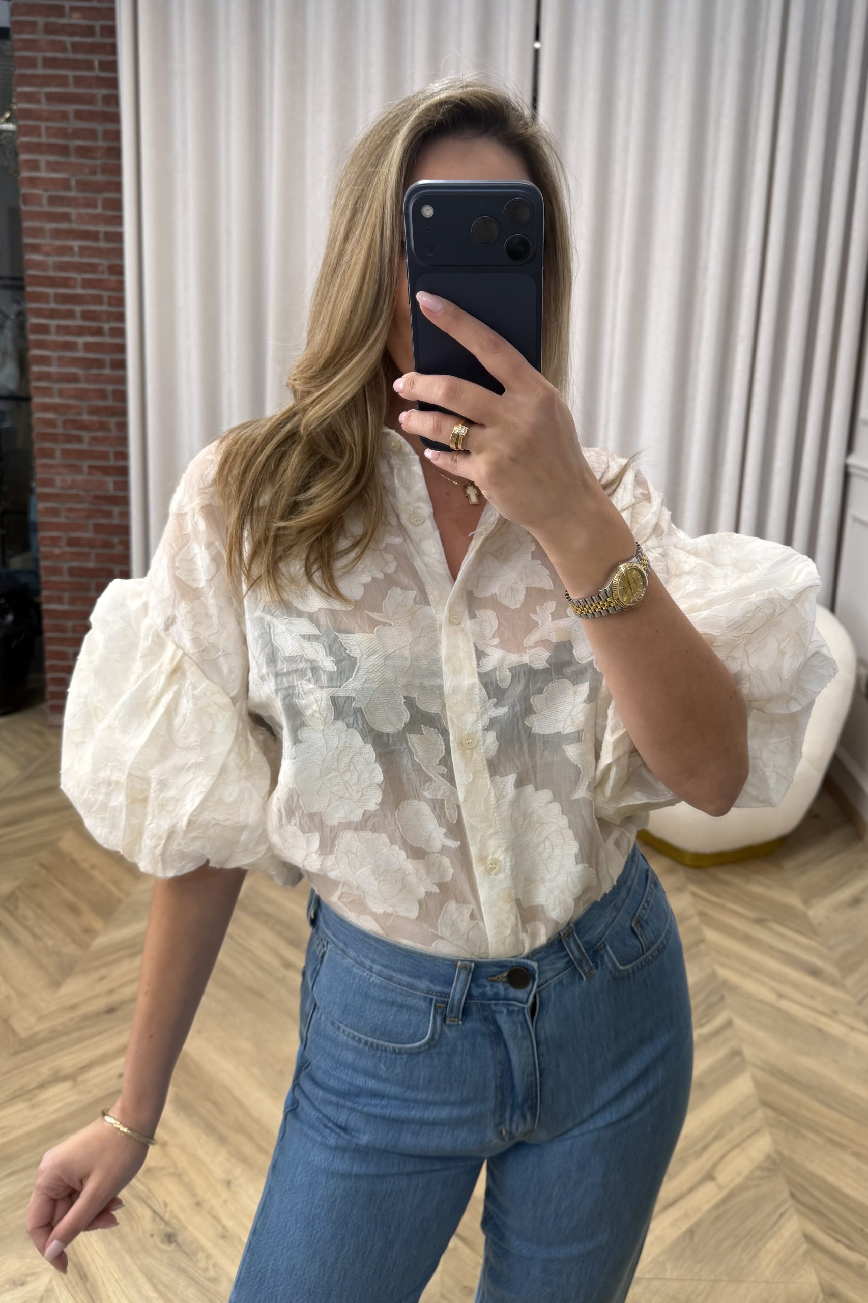 Πουκάμισο με έντονο σχεδιαστικό χαρακτήρα που ισορροπεί ανάμεσα στη ρομαντική αισθητική και τη σύγχρονη κομψότητα. Η ημιδιάφανη υφή του υφάσματος δημιουργεί μια αίσθηση ελαφρότητας, ενώ το διακριτικό μοτίβο προσθέτει βάθος και υφή στο σχέδιο. Τα μανίκια με όγκο χαρίζουν δραματικότητα στη σιλουέτα, δημιουργώντας ένα εντυπωσιακό παιχνίδι όγκων που αναδεικνύει το επάνω μέρος του σώματος. Ο κλασικός γιακάς και το μπροστινό κούμπωμα ισορροπούν τη θεατρικότητα του σχεδίου με μια διαχρονική δομή. Ένα κομμάτι με έντονη editorial διάθεση, ιδανικό για εμφανίσεις που συνδυάζουν θηλυκότητα, κομψότητα και σύγχρονο στιλ.