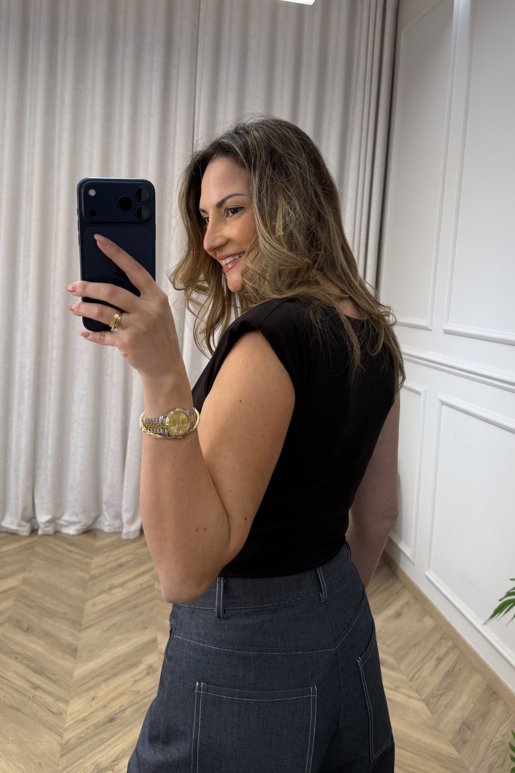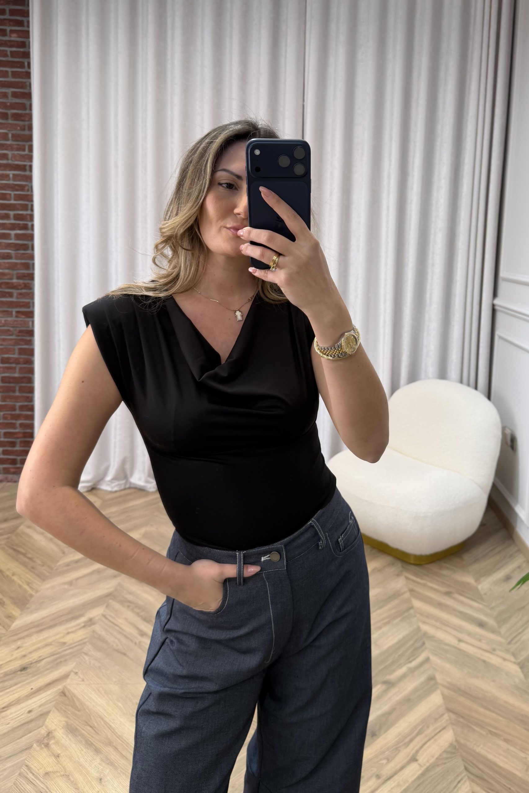 Κορμάκι με εκλεπτυσμένη, θηλυκή αισθητική που αγκαλιάζει τη σιλουέτα και αναδεικνύει τη γραμμή του σώματος. Το εντυπωσιακό ντραπέ ντεκολτέ δημιουργεί φυσική κίνηση και απαλή ροή στο επάνω μέρος, χαρίζοντας κομψότητα και διακριτικό sensual χαρακτήρα. Η εφαρμογή είναι σταθερή και άνετη, με καθαρές ραφές που προσφέρουν λεία όψη και άψογο τελείωμα κάτω από παντελόνια ή φούστες. Το κλείσιμο στο κάτω μέρος εξασφαλίζει πρακτικότητα και τέλεια εφαρμογή καθ’ όλη τη διάρκεια της ημέρας. Ιδανικό για minimal βραδινά looks με tailored κομμάτια, αλλά και για πιο σύγχρονους συνδυασμούς με denim ή κοστούμι. Ένα statement basic που ισορροπεί ανάμεσα στη διαχρονικότητα και τη σύγχρονη κομψότητα.