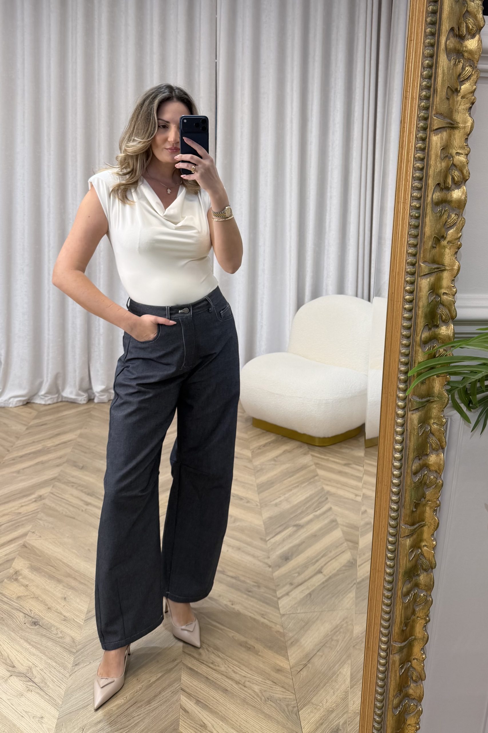 Κορμάκι με εκλεπτυσμένη, θηλυκή αισθητική που αγκαλιάζει τη σιλουέτα και αναδεικνύει τη γραμμή του σώματος. Το εντυπωσιακό ντραπέ ντεκολτέ δημιουργεί φυσική κίνηση και απαλή ροή στο επάνω μέρος, χαρίζοντας κομψότητα και διακριτικό sensual χαρακτήρα. Η εφαρμογή είναι σταθερή και άνετη, με καθαρές ραφές που προσφέρουν λεία όψη και άψογο τελείωμα κάτω από παντελόνια ή φούστες. Το κλείσιμο στο κάτω μέρος εξασφαλίζει πρακτικότητα και τέλεια εφαρμογή καθ’ όλη τη διάρκεια της ημέρας. Ιδανικό για minimal βραδινά looks με tailored κομμάτια, αλλά και για πιο σύγχρονους συνδυασμούς με denim ή κοστούμι. Ένα statement basic που ισορροπεί ανάμεσα στη διαχρονικότητα και τη σύγχρονη κομψότητα.