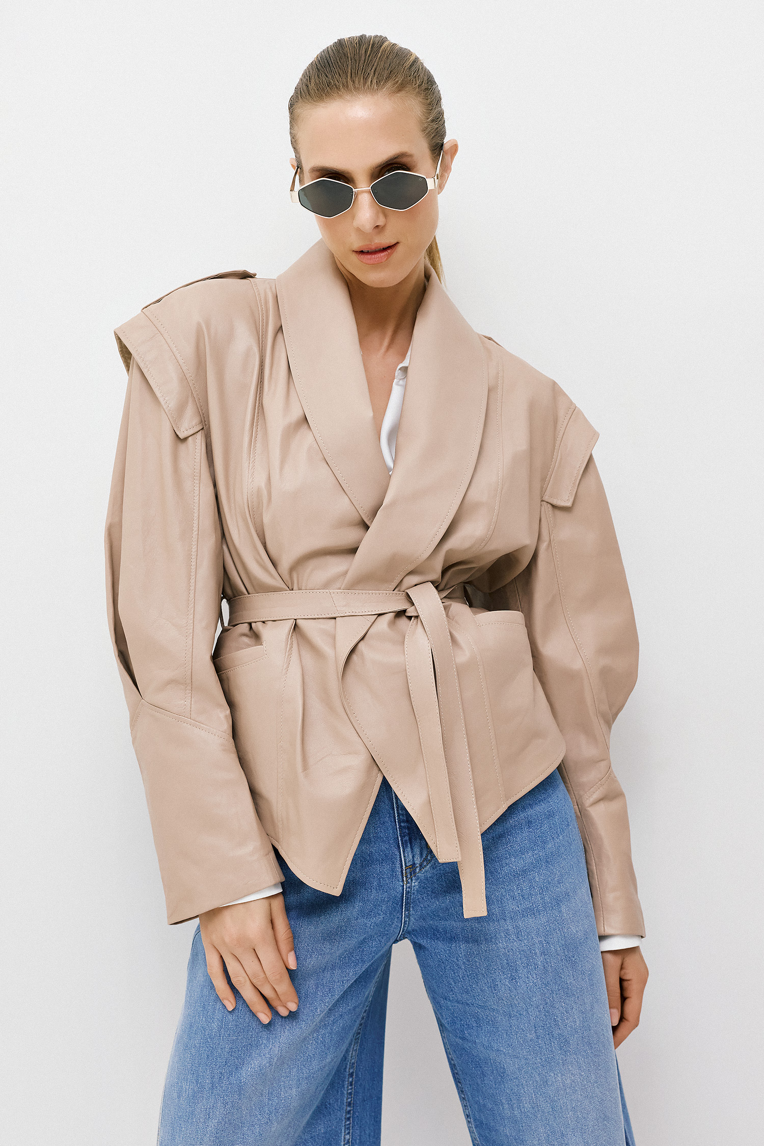 Leather Belted Jacket – Beige