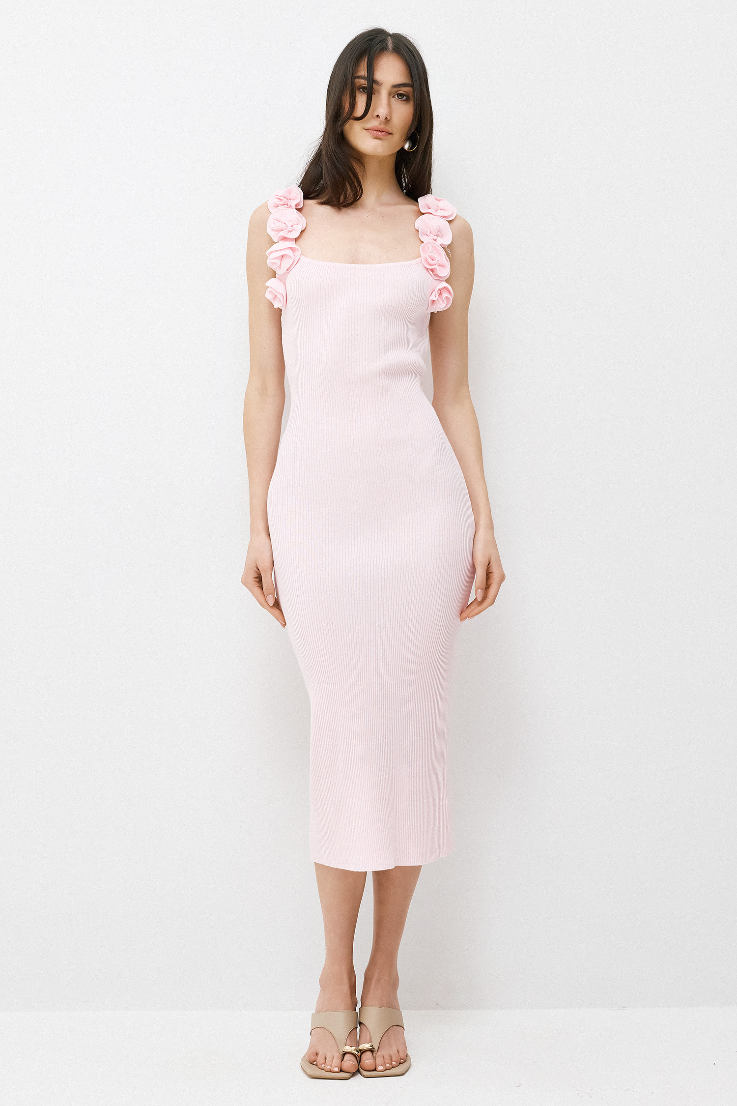 Ένα εφαρμοστό midi φόρεμα που αποπνέει διαχρονική κομψότητα με σύγχρονη αισθητική. Η rib υφή αγκαλιάζει τη σιλουέτα, αναδεικνύοντας τις γραμμές του σώματος με φυσικό και κομψό τρόπο, ενώ η καθαρή γραμμή του δημιουργεί ένα minimal αλλά εντυπωσιακό αποτέλεσμα. Οι λεπτές τιράντες διακοσμημένες με διακριτικά τρισδιάστατα στοιχεία προσθέτουν μια ρομαντική και ιδιαίτερη πινελιά, δίνοντας χαρακτήρα στο σύνολο. Ένα ευέλικτο κομμάτι που μπορεί να σταθεί μόνο του ή να αποτελέσει βάση για layered εμφανίσεις, ιδανικό για looks που κινούνται από το πρωί έως το βράδυ με effortless sophistication.