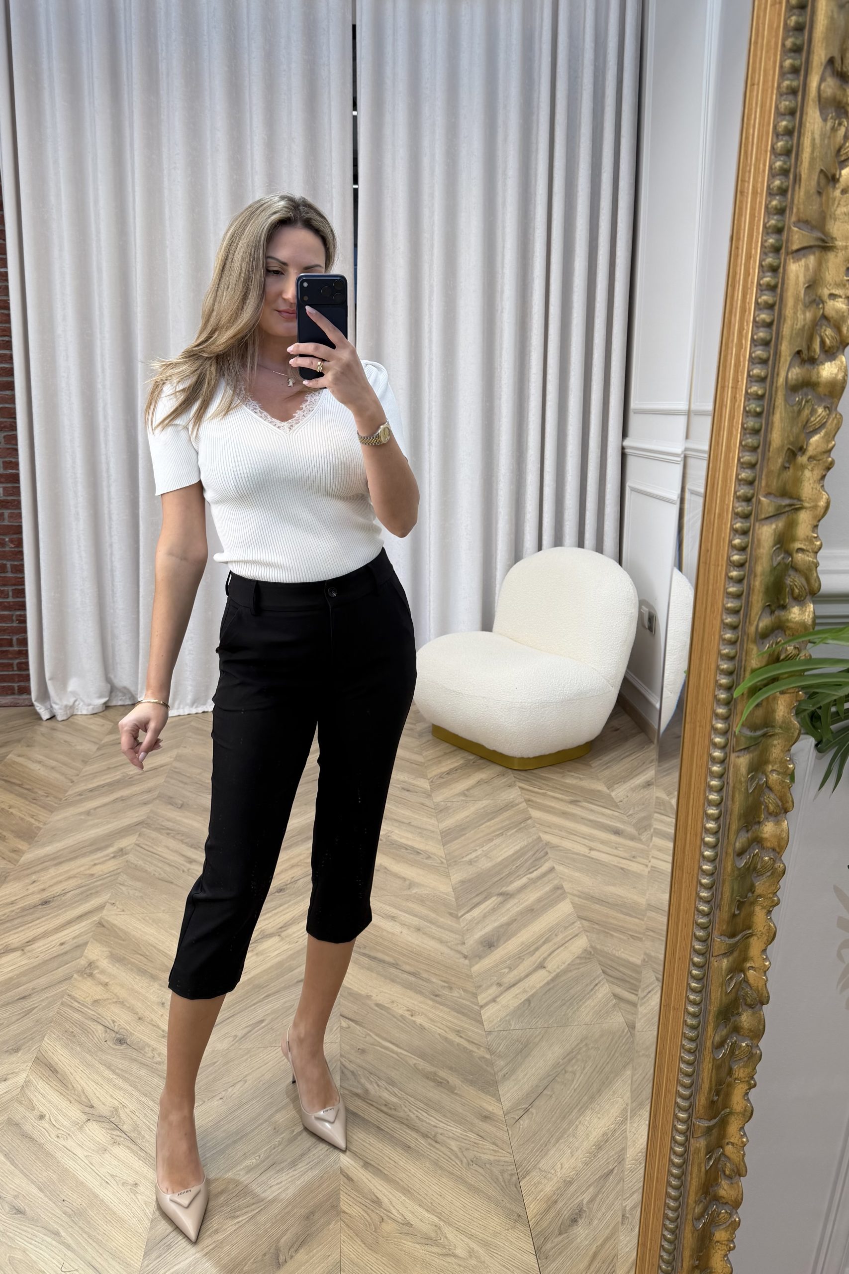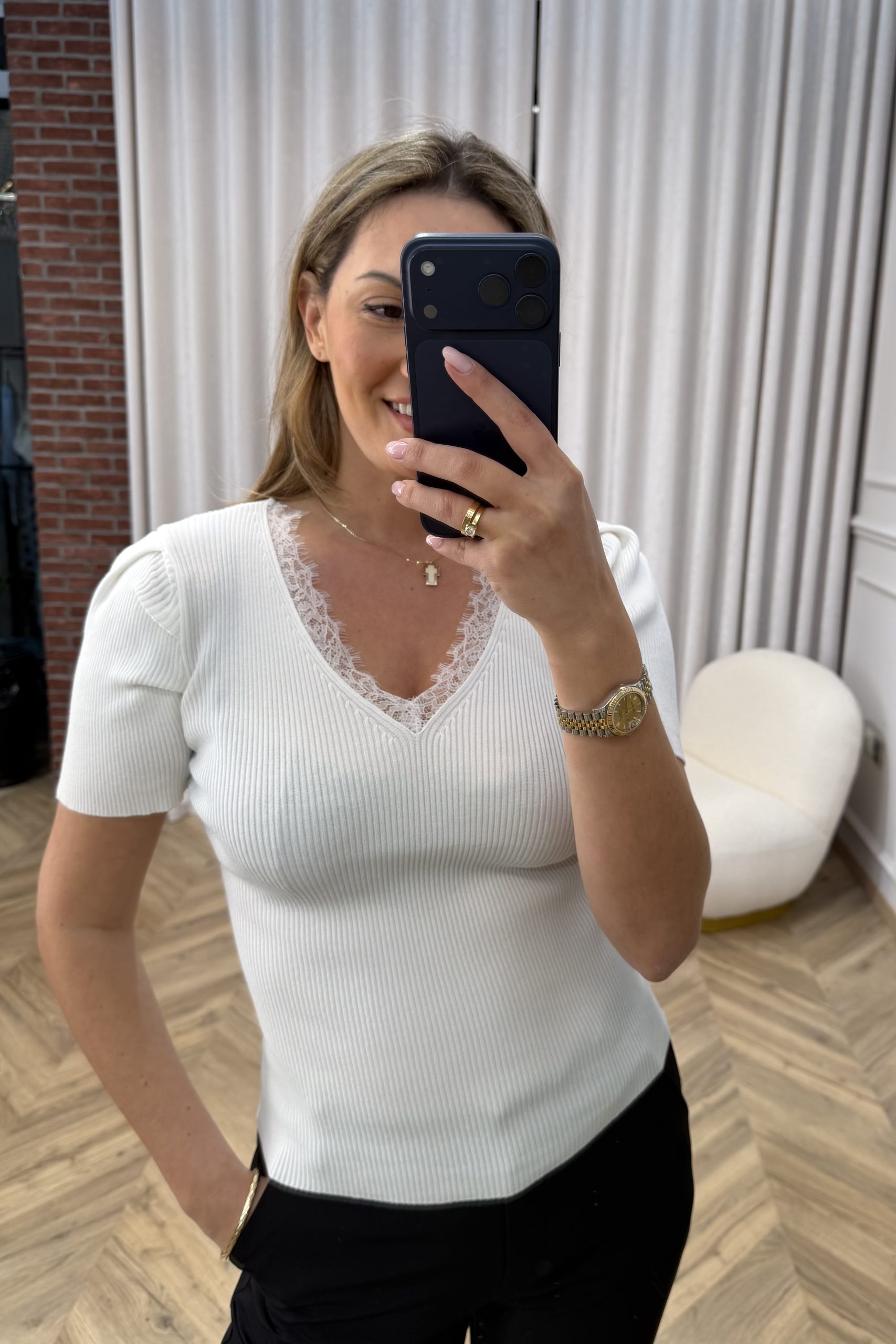 Ένα κομψό πλεκτό τοπ που ξεχωρίζει για τη διακριτική του θηλυκότητα και τη minimal αισθητική. Η απαλή υφή του αγκαλιάζει το σώμα δημιουργώντας μια εφαρμοστή, κομψή σιλουέτα, ενώ η λαιμόκοψη σε σχήμα V διακοσμημένη με λεπτή δαντέλα προσθέτει μια ρομαντική πινελιά στο σχέδιο. Τα κοντά μανίκια και η καθαρή γραμμή το καθιστούν ιδανικό για καθημερινές αλλά και πιο προσεγμένες εμφανίσεις, αποτελώντας ένα ευέλικτο κομμάτι που συνδυάζεται εύκολα με κάθε στιλ.