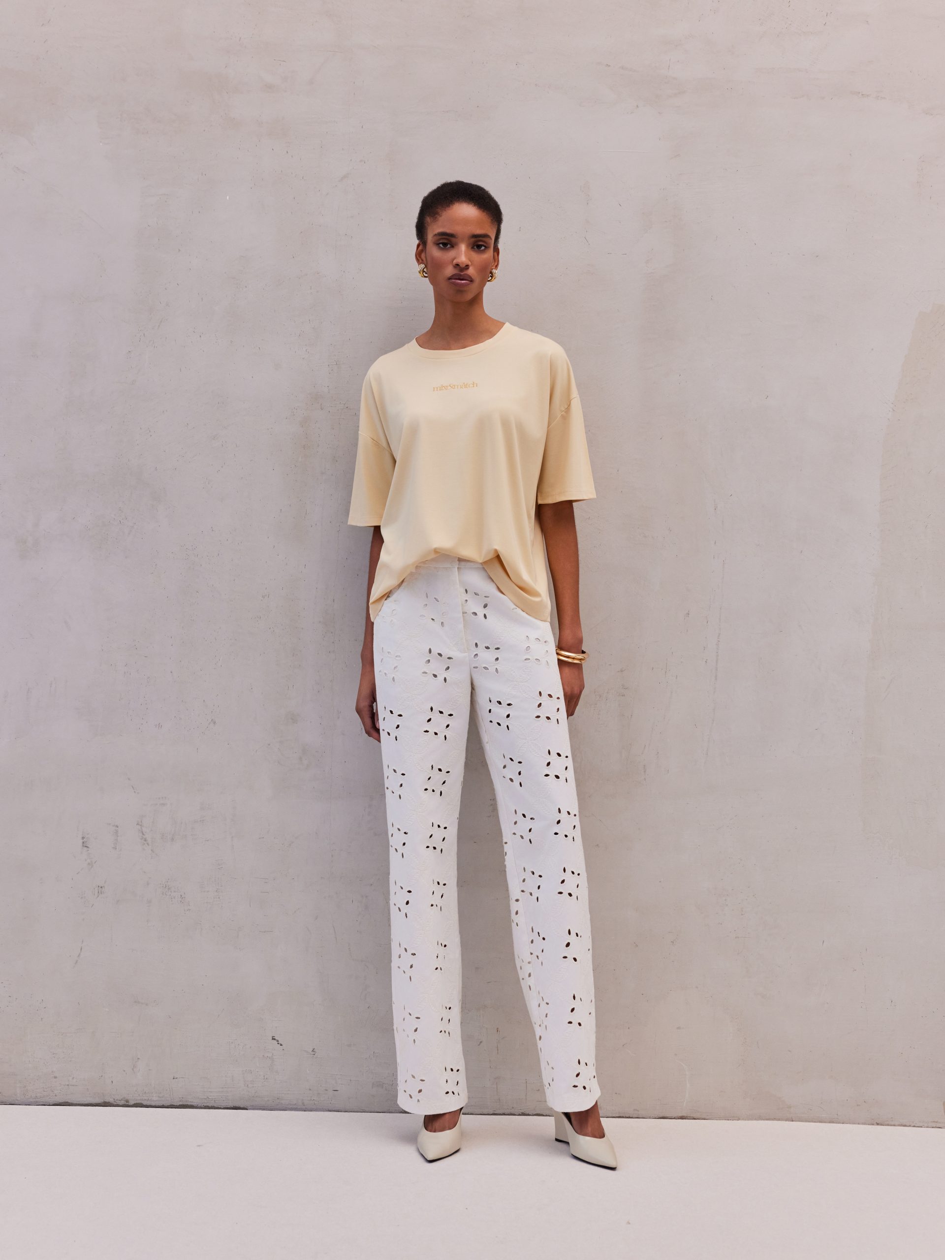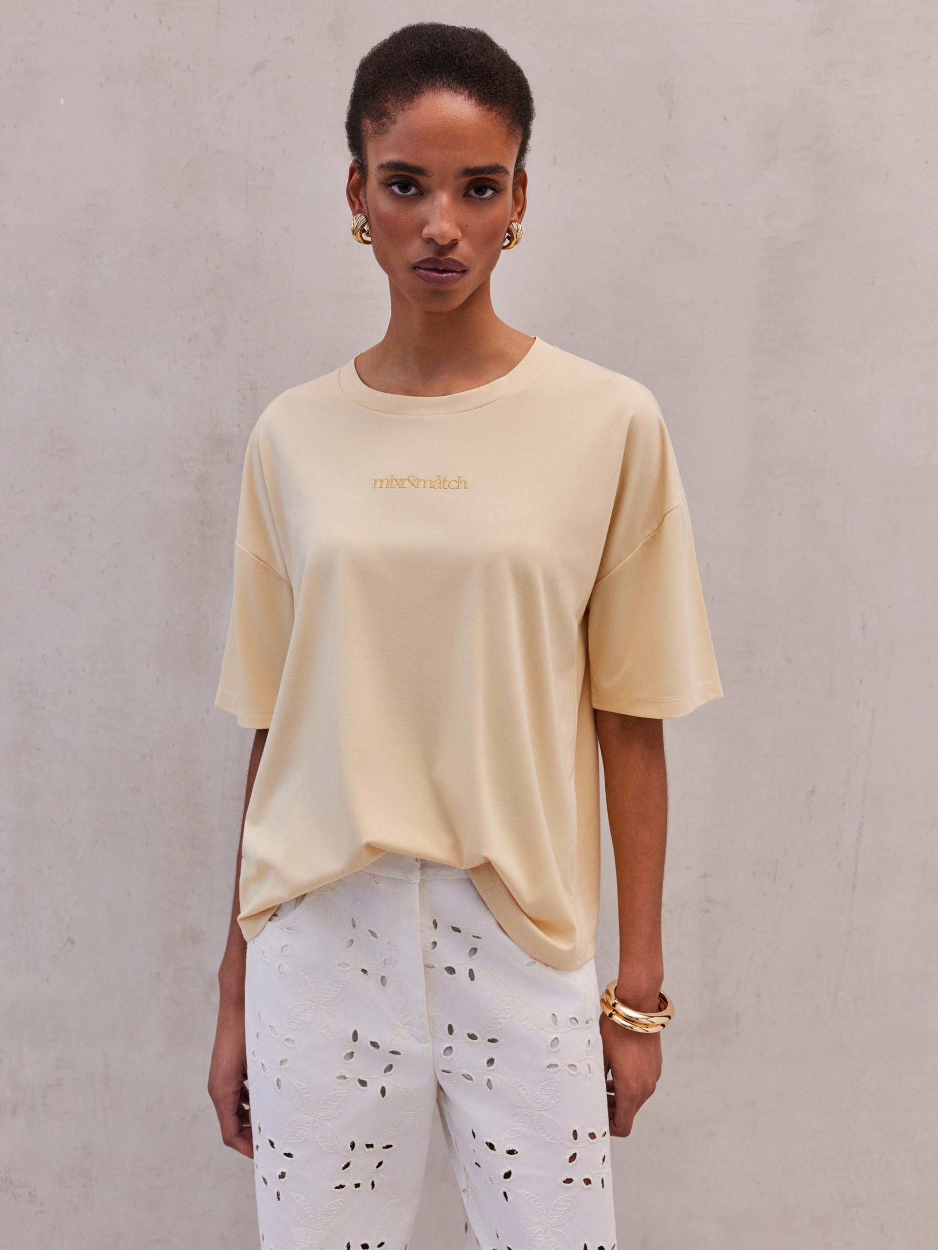 To Mia T-shirt είναι ένα basic oversized t-shirt με χαλαρή εφαρμογή και διακριτικό ανάγλυφο το logo μας στο μπροστινό μέρος. Κατάλληλο για καθημερινό styling, φοριέται άνετα μόνο του ή ως layering piece με άλλα κομμάτια. Ένα απαραίτητο ρούχο για κάθε capsule γκαρνταρόμπα.
