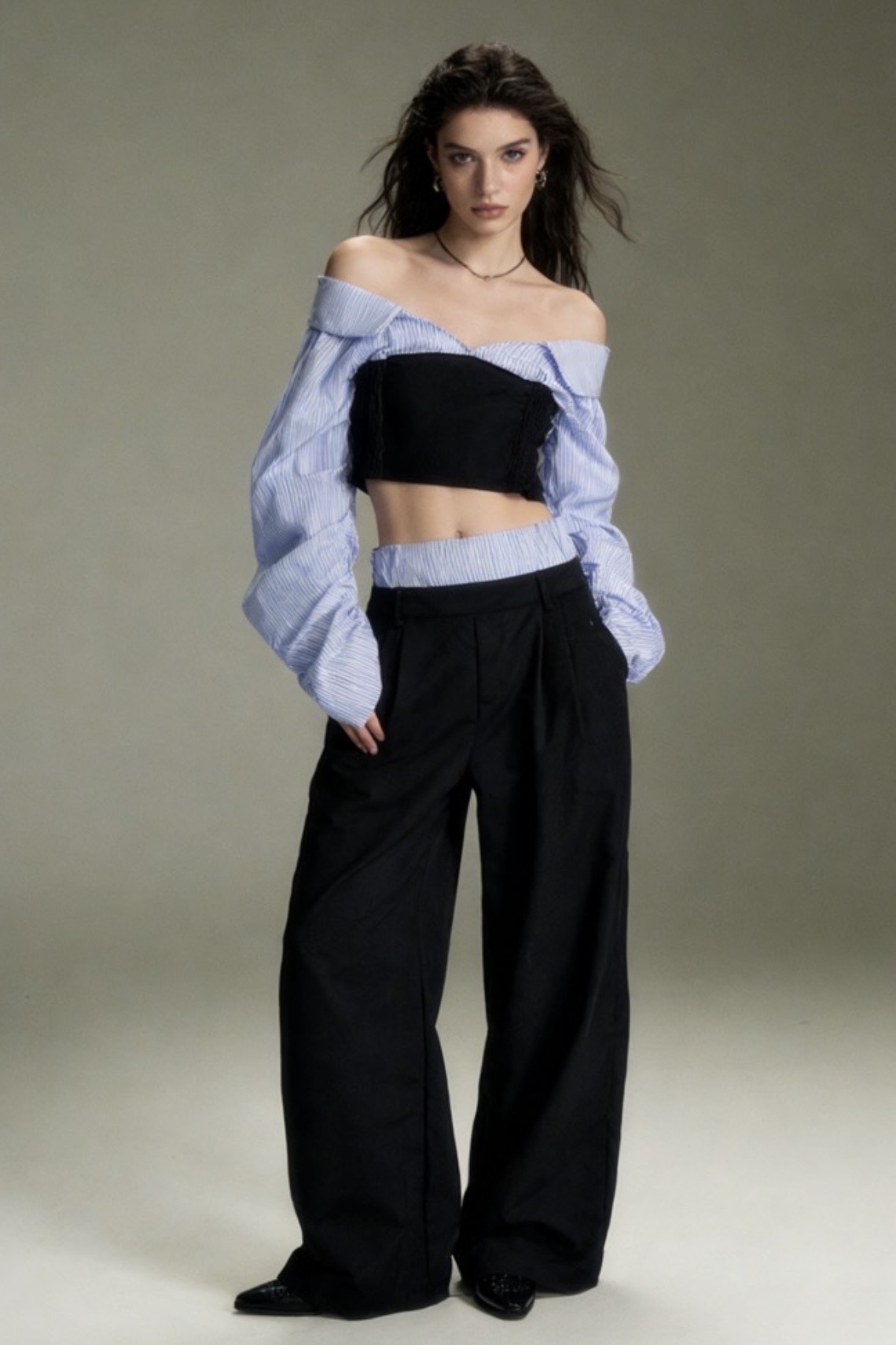 Ένα σύνολο που εξερευνά την ισορροπία ανάμεσα στο tailoring και τη ρευστότητα. Το off-shoulder top αναδεικνύει τη σιλουέτα μέσα από καθαρές γραμμές και αρχιτεκτονική εφαρμογή, ενώ τα ανάλαφρα μανίκια προσθέτουν κίνηση και αντίθεση στην κατασκευή. Το παντελόνι, με φαρδιά γραμμή και άψογη πτώση, ολοκληρώνει το look με μια αίσθηση διαχρονικής κομψότητας και δυναμισμού. Ένα editorial σύνολο που προσαρμόζεται εύκολα, αποπνέοντας αυτοπεποίθηση και σύγχρονο χαρακτήρα, ιδανικό για εμφανίσεις με ξεκάθαρη fashion ταυτότητα.