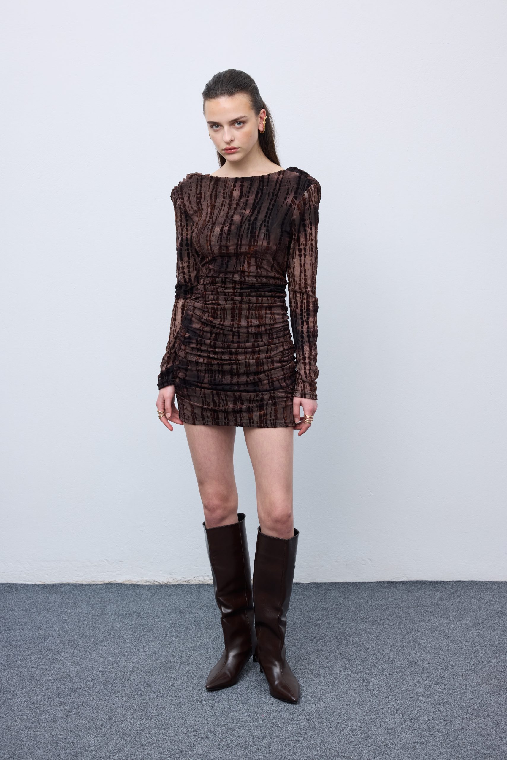Το φόρεμα Second Skin Mesh είναι ένα φόρεμα που αγκαλιάζει το σώμα και συνδυάζει τέλεια την κομψότητα και το στυλ. Κατασκευασμένο από απαλό, ημιδιαφανές ύφασμα mesh, διαθέτει μια σούρες που κολακεύει τη σιλουέτα και δημιουργεί μια σμιλεμένη εμφάνιση. Το φόρεμα έχει μακριά μανίκια, κοντό στρίφωμα και ένα διακριτικό ντραπέ ντεκολτέ που μπορεί να φορεθεί έξω από τους ώμους ή ως λαιμόκοψη για μια ευέλικτη πινελιά. Το πλούσιο καφέ tie-dye μοτίβο του προσθέτει βάθος και υφή, καθιστώντας το ιδανικό τόσο για καθημερινή όσο και για βραδινή χρήση