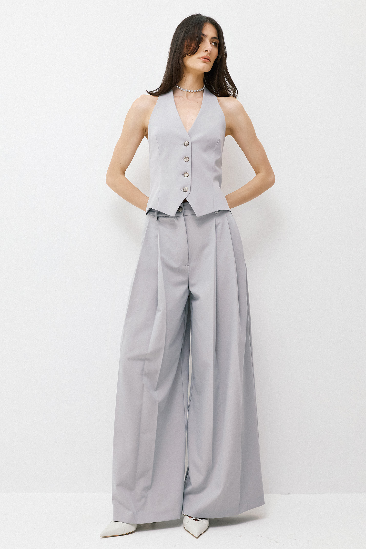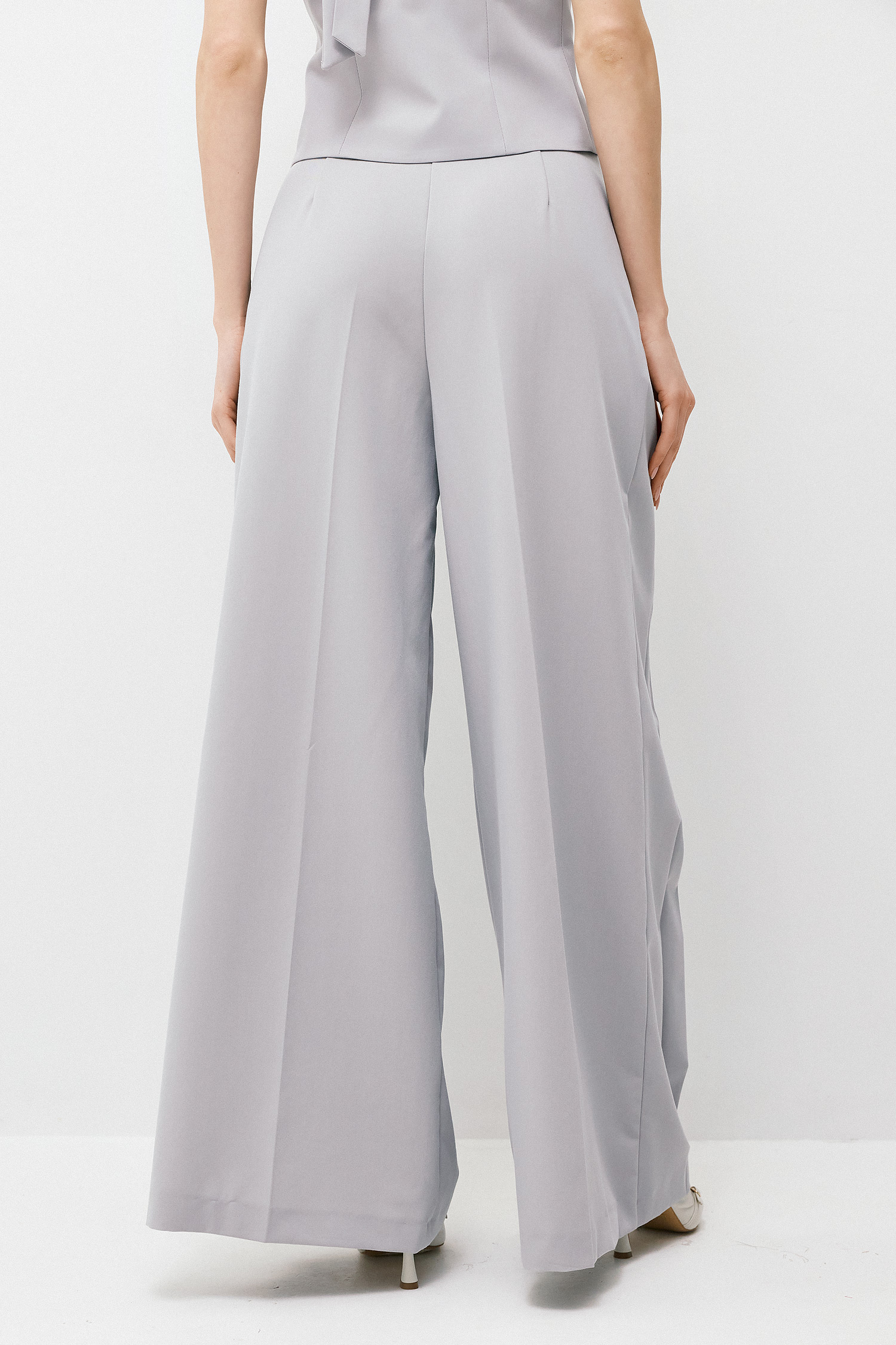 Ψηλόμεσο παντελόνι σε wide-leg γραμμή, σχεδιασμένο να προσφέρει effortless κίνηση και διαχρονική κομψότητα. Οι μπροστινές πιέτες ενισχύουν τη δομή του, δημιουργώντας όγκο με απόλυτη ισορροπία και αναδεικνύοντας τη μέση. Το ρευστό πέσιμο του υφάσματος επιμηκύνει τη σιλουέτα και χαρίζει μια αίσθηση πολυτέλειας σε κάθε βήμα. Ιδανικό για total tailored εμφανίσεις σε συνδυασμό με το σακάκι, αλλά και για πιο σύγχρονους συνδυασμούς με tops ή πουκάμισα για day-to-night looks.