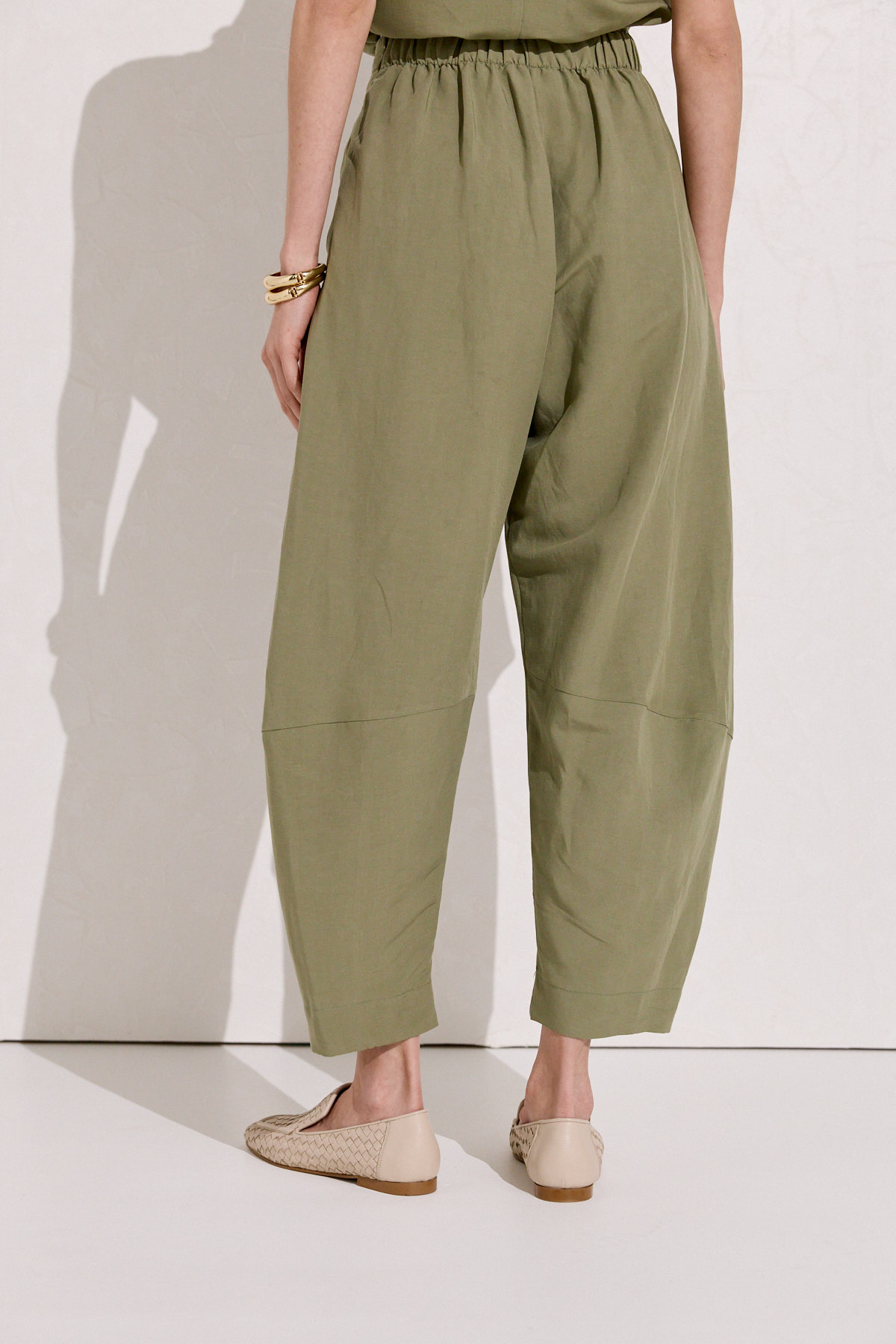 Ένα παντελόνι που συνδυάζει άνεση και σύγχρονη κομψότητα μέσα από καθαρές, αρχιτεκτονικές γραμμές. Η ψηλόμεση εφαρμογή αγκαλιάζει τη μέση και διαμορφώνει μια επιμηκυμένη σιλουέτα, ενώ η χαλαρή γραμμή που στενεύει διακριτικά προς το τελείωμα δημιουργεί ένα refined, effortless αποτέλεσμα. Η λιτή κατασκευή του επιτρέπει στο πατρόν να αναδειχθεί, προσφέροντας φυσική κίνηση και ισορροπία σε κάθε βήμα. Το μήκος που σταματά ελαφρώς πάνω από τον αστράγαλο ενισχύει τον μοντέρνο χαρακτήρα του και το καθιστά ιδανικό τόσο για καθημερινές εμφανίσεις όσο και για πιο προσεγμένα σύνολα. Ένα ευέλικτο κομμάτι με σύγχρονη tailoring αισθητική, σχεδιασμένο να λειτουργεί ως βασικός πυλώνας μιας καλοδουλεμένης γκαρνταρόμπας.