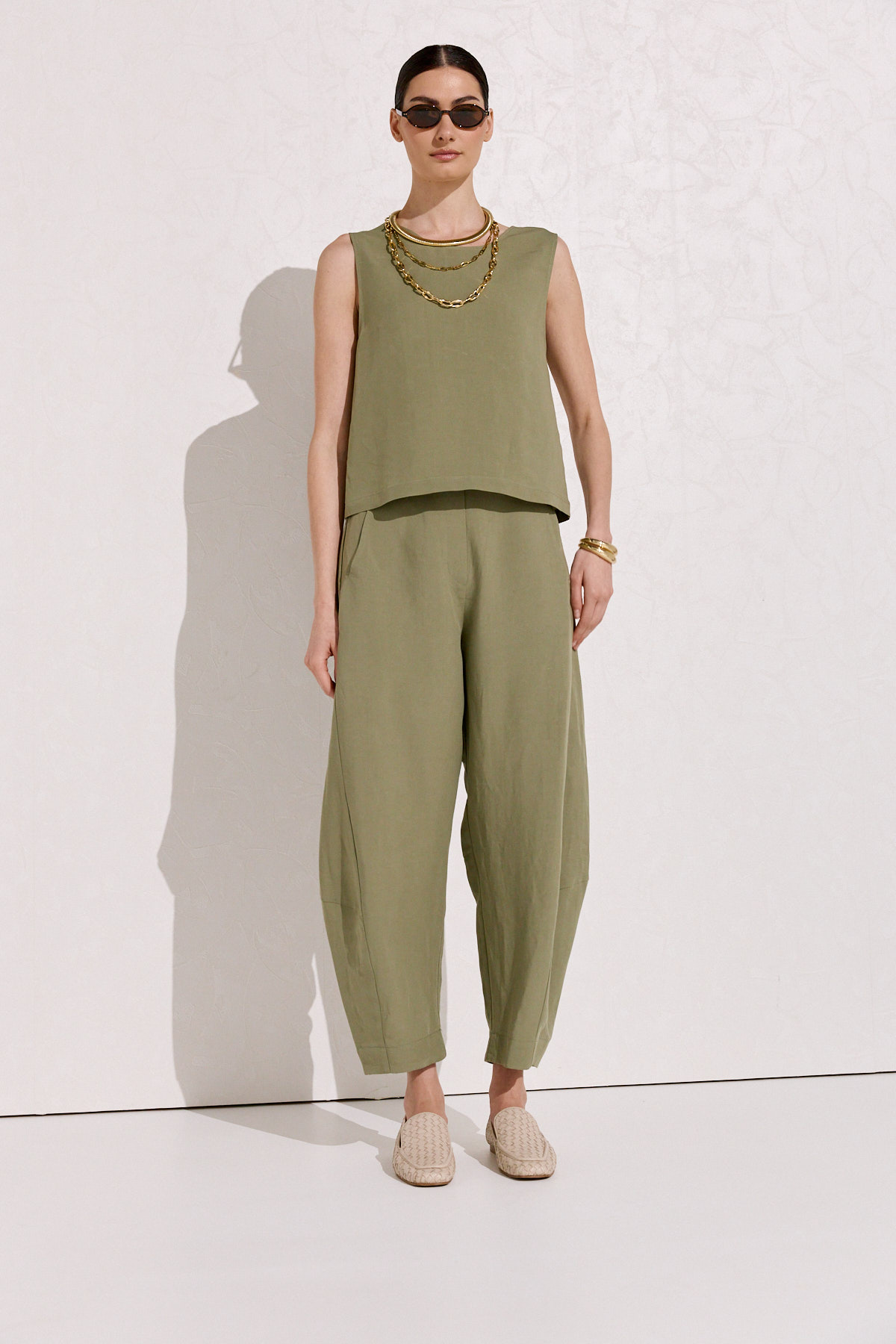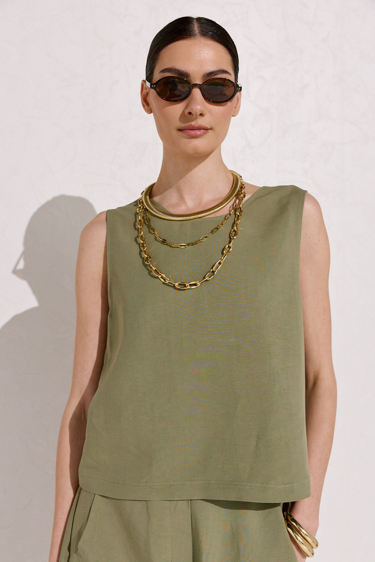 Ένα sleeveless top που εκφράζει την ουσία του σύγχρονου minimal design μέσα από καθαρές γραμμές και διαχρονική απλότητα. Η ίσια, ελαφρώς χαλαρή γραμμή του αγκαλιάζει το σώμα με φυσικό τρόπο, προσφέροντας άνεση και κομψή ροή στην κίνηση. Η στρογγυλή λαιμόκοψη και τα προσεγμένα τελειώματα ενισχύουν τον refined χαρακτήρα του, καθιστώντας το ιδανική βάση για layering αλλά και για αυτόνομα, statement looks. Η λιτή του αισθητική επιτρέπει στους συνδυασμούς να αναδειχθούν, είτε σε καθημερινές εμφανίσεις είτε σε πιο προσεγμένα σύνολα με έντονα αξεσουάρ. Συνδυάζεται με το αντίστοιχο παντελόνι της συλλογής, δημιουργώντας ένα ολοκληρωμένο σετ με ισορροπημένη σιλουέτα και σύγχρονη tailoring διάθεση.