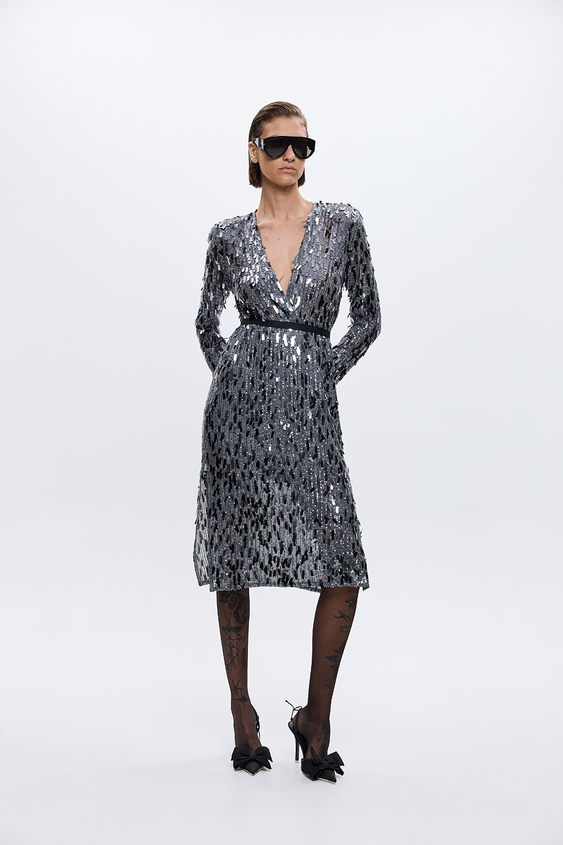 Ένα εκθαμβωτικό φόρεμα μέχρι το γόνατο, ολόκληρο καλυμμένο με ασημί παγιέτες που αντανακλούν το φως με κάθε κίνηση. Διαθέτει βαθύ ντεκολτέ σε σχήμα V, μακριά μανίκια και ελαφρώς τονισμένη μέση που αγκαλιάζει διακριτικά τη σιλουέτα χωρίς να χρειάζεται ζώνη. Το ύφασμα έχει δομή αλλά και ρευστότητα, προσδίδοντας λαμπερή και κομψή παρουσία. Ιδανικό για βραδινές εμφανίσεις, αποπνέει σύγχρονη γοητεία και δυναμισμό.